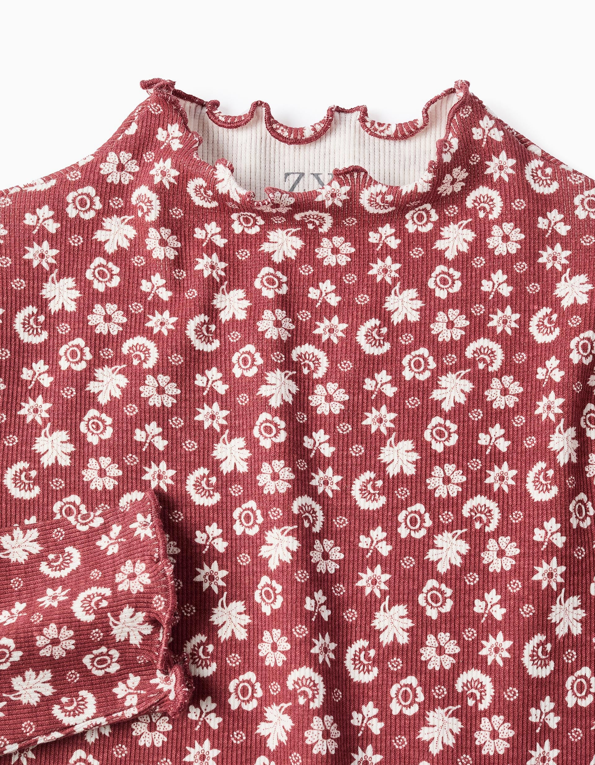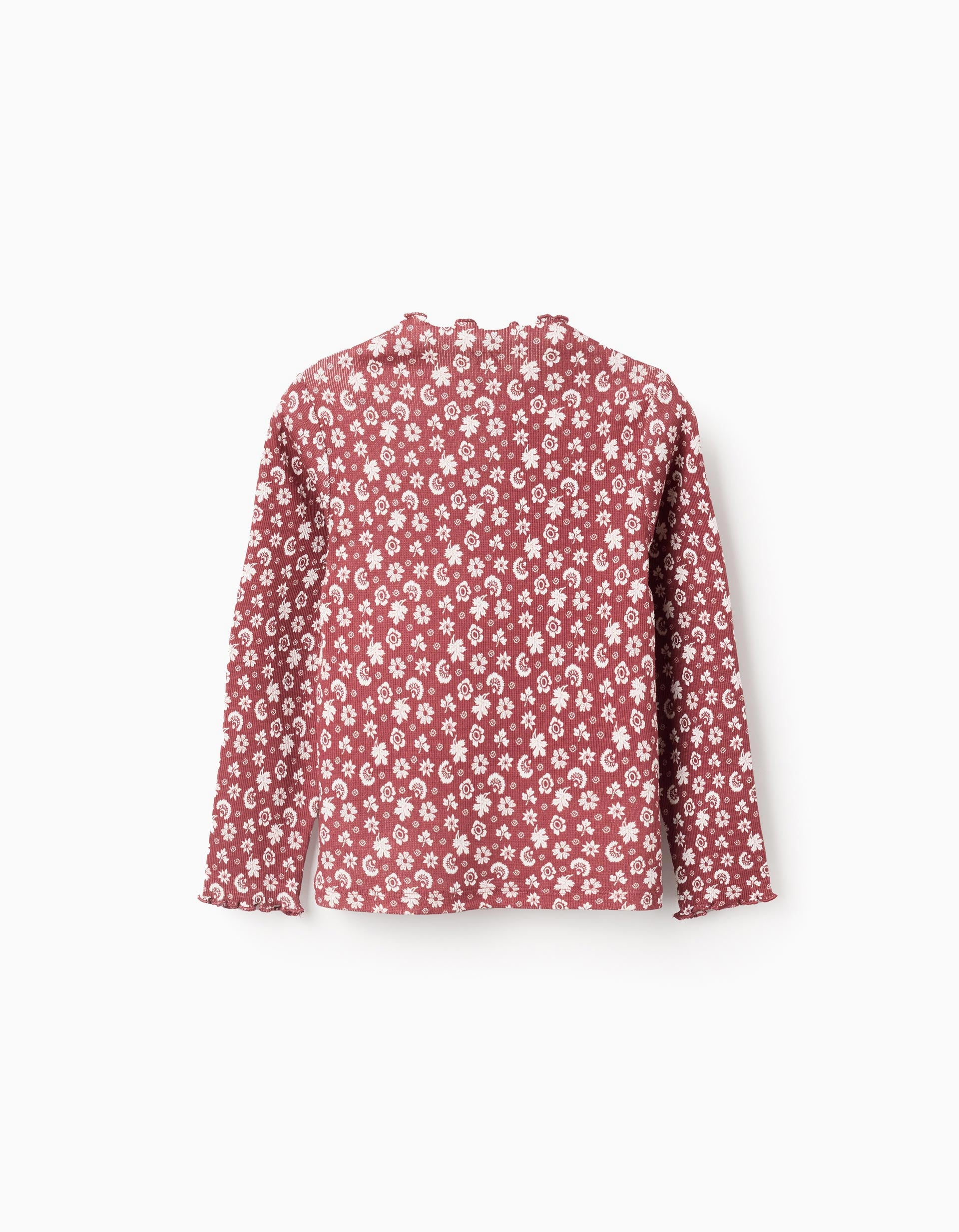 Brown long sleeve ribbed T-shirt for girls. Wavy edges. White flower motif for a cheerful touch. Printed inner labels to avoid irritating the skin. For everyday looks! We Care: Oeko-Tex Standard 100 certified item, ensuring the absence of harmful or irritating substances for the skin.