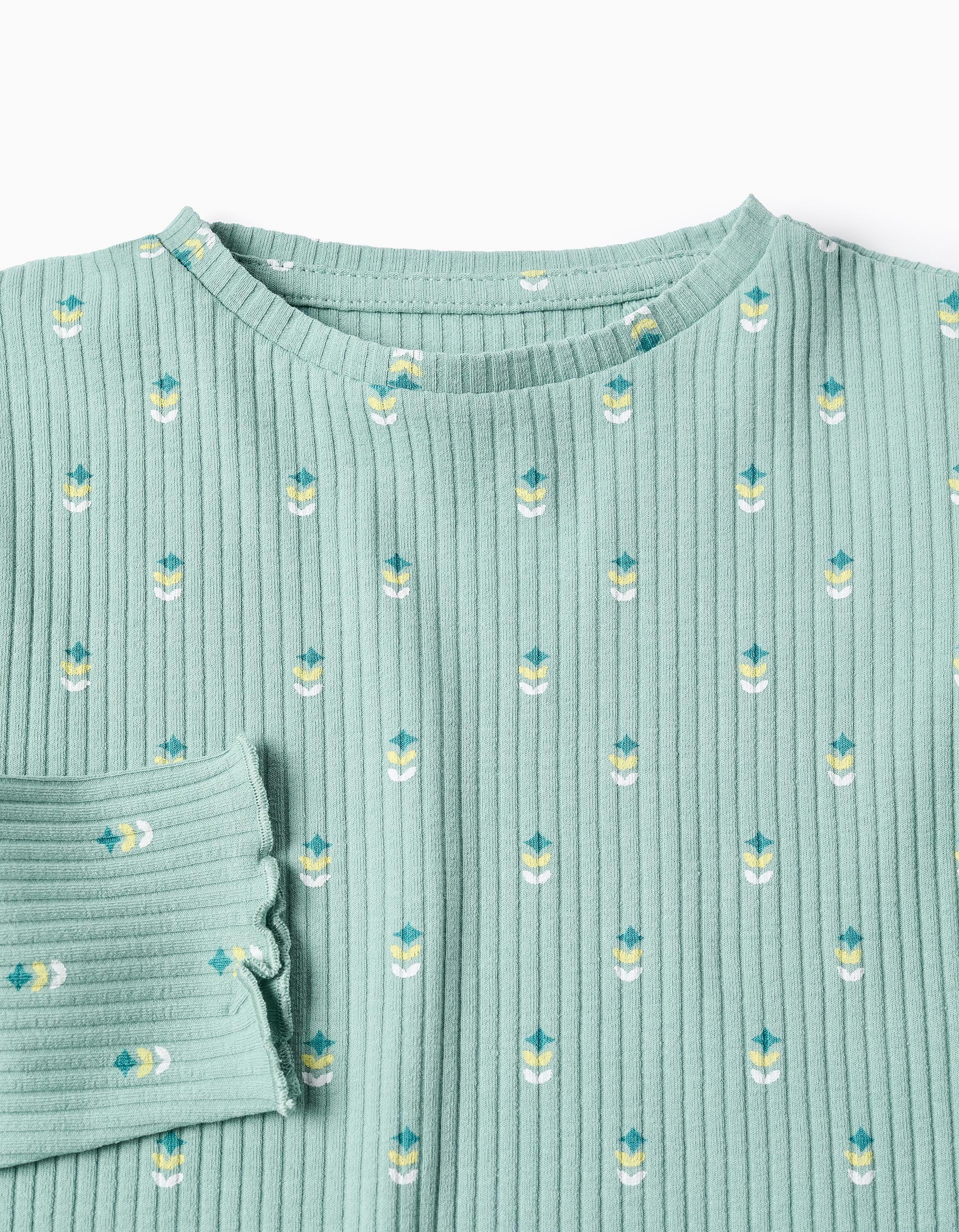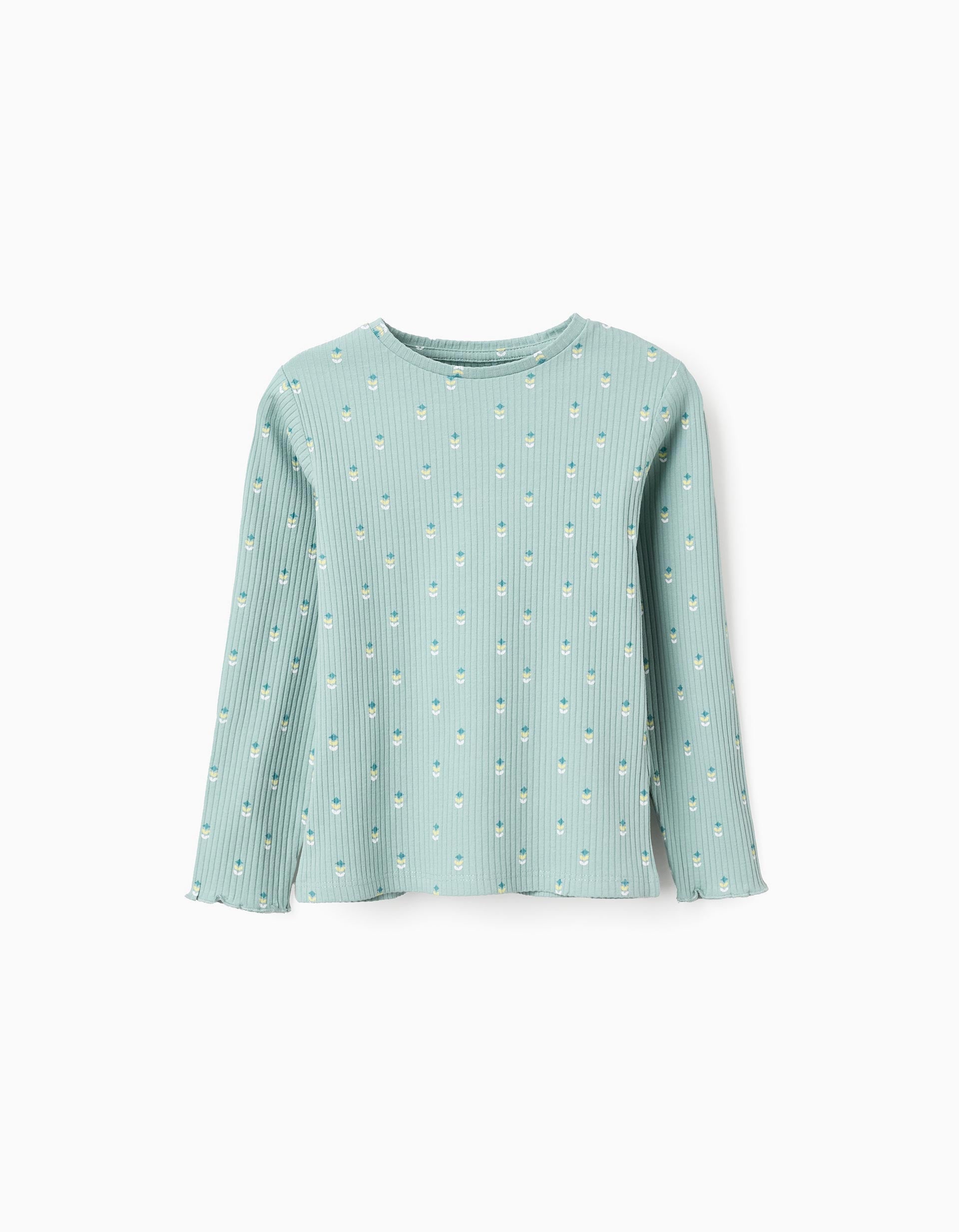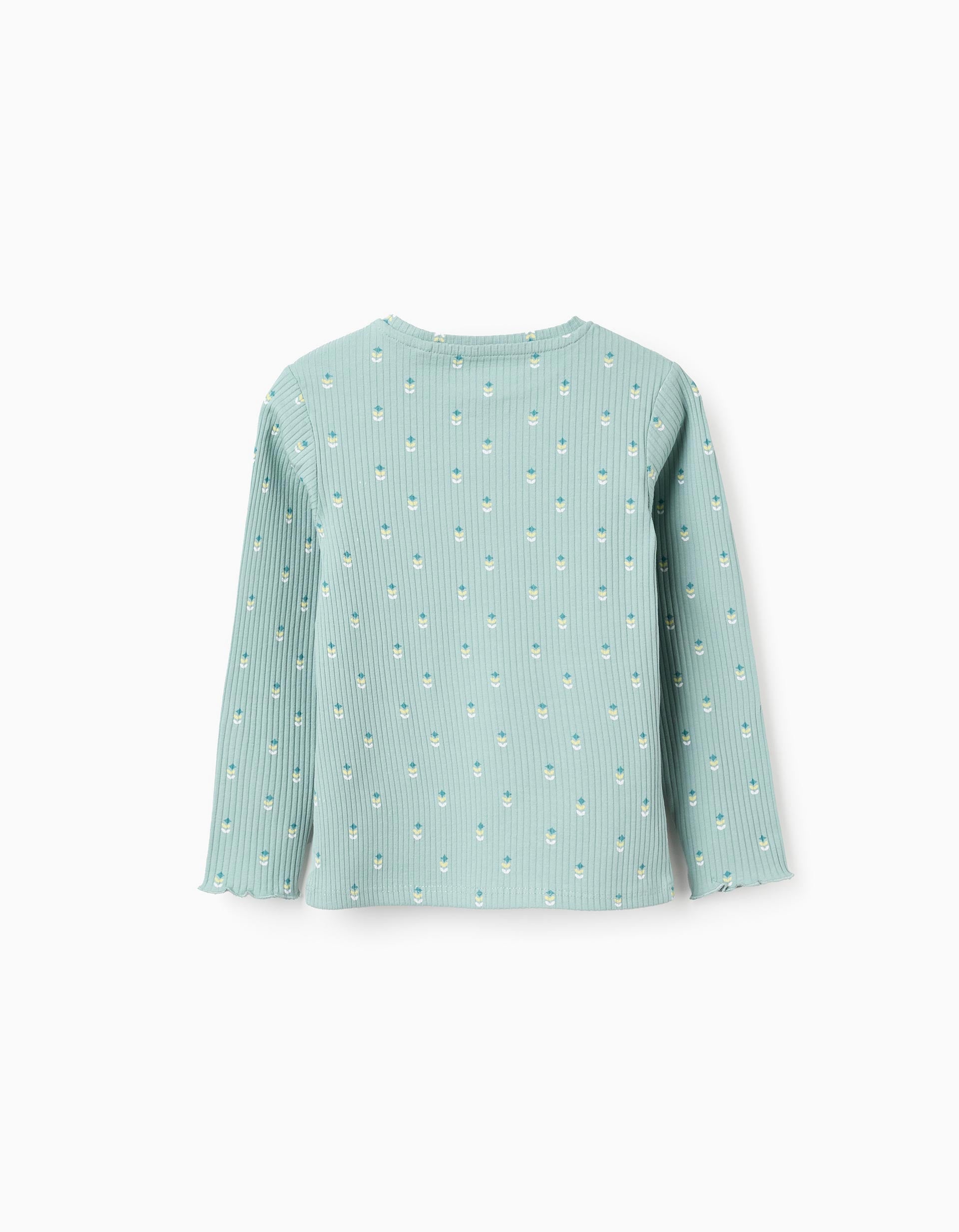 Light green long sleeve ribbed T-shirt for girls. Wavy edges. Floral motif for a cheerful touch. Printed inner labels to avoid irritating the skin. For everyday looks! We Care: Oeko-Tex Standard 100 certified item, ensuring the absence of harmful or irritating substances for the skin.