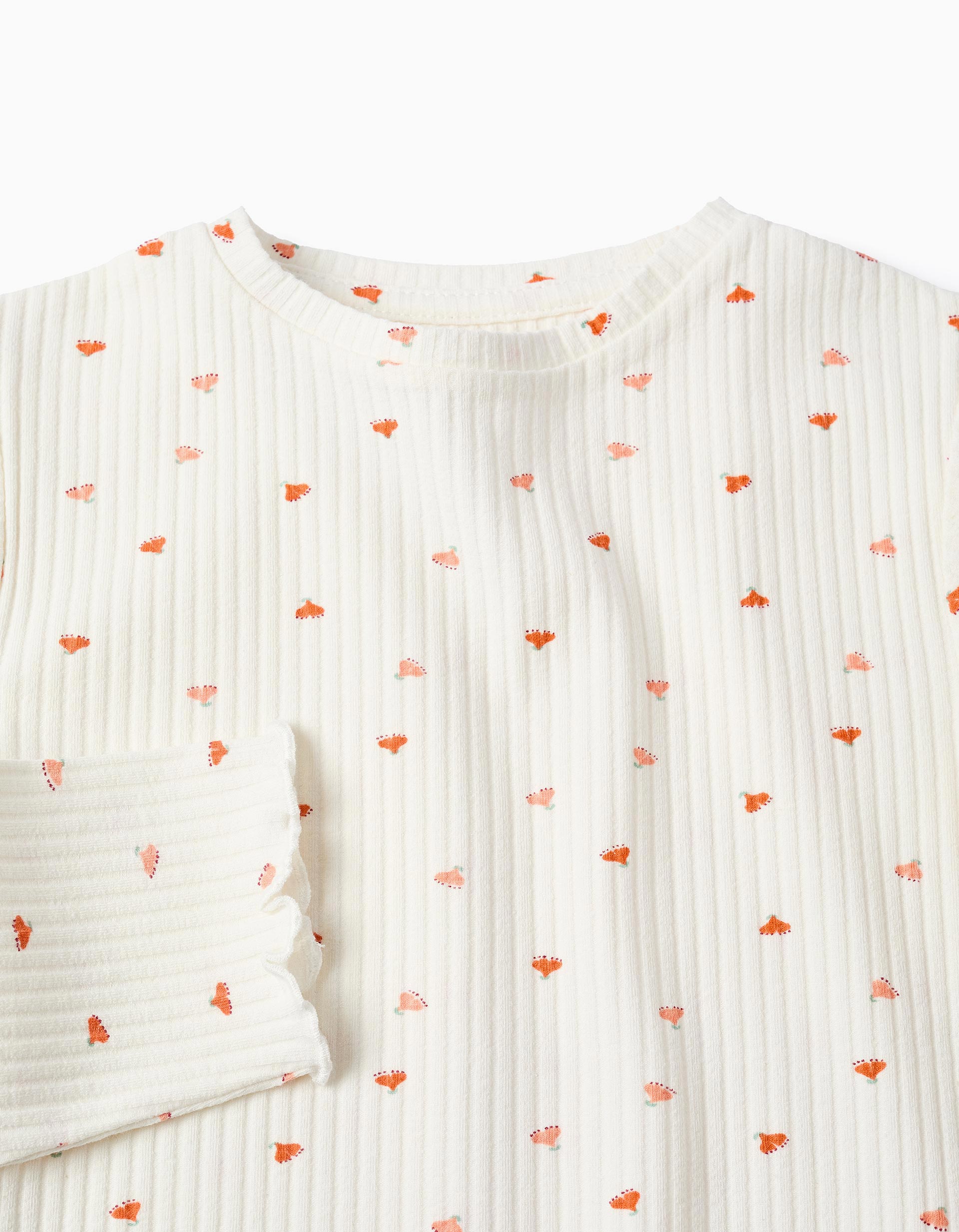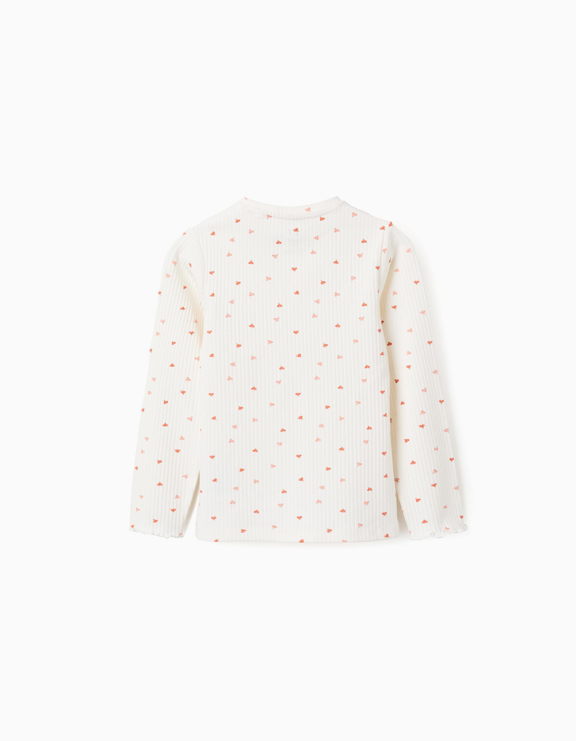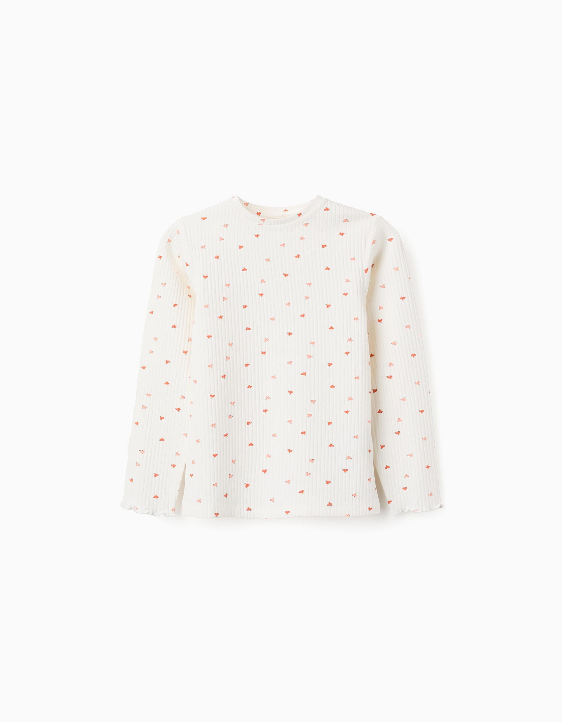 White long sleeve ribbed T-shirt for girls. Wavy edges. Floral motif for a cheerful touch. Printed inner labels to avoid irritating the skin. For everyday looks! We Care: Oeko-Tex Standard 100 certified item, ensuring the absence of harmful or irritating substances for the skin.