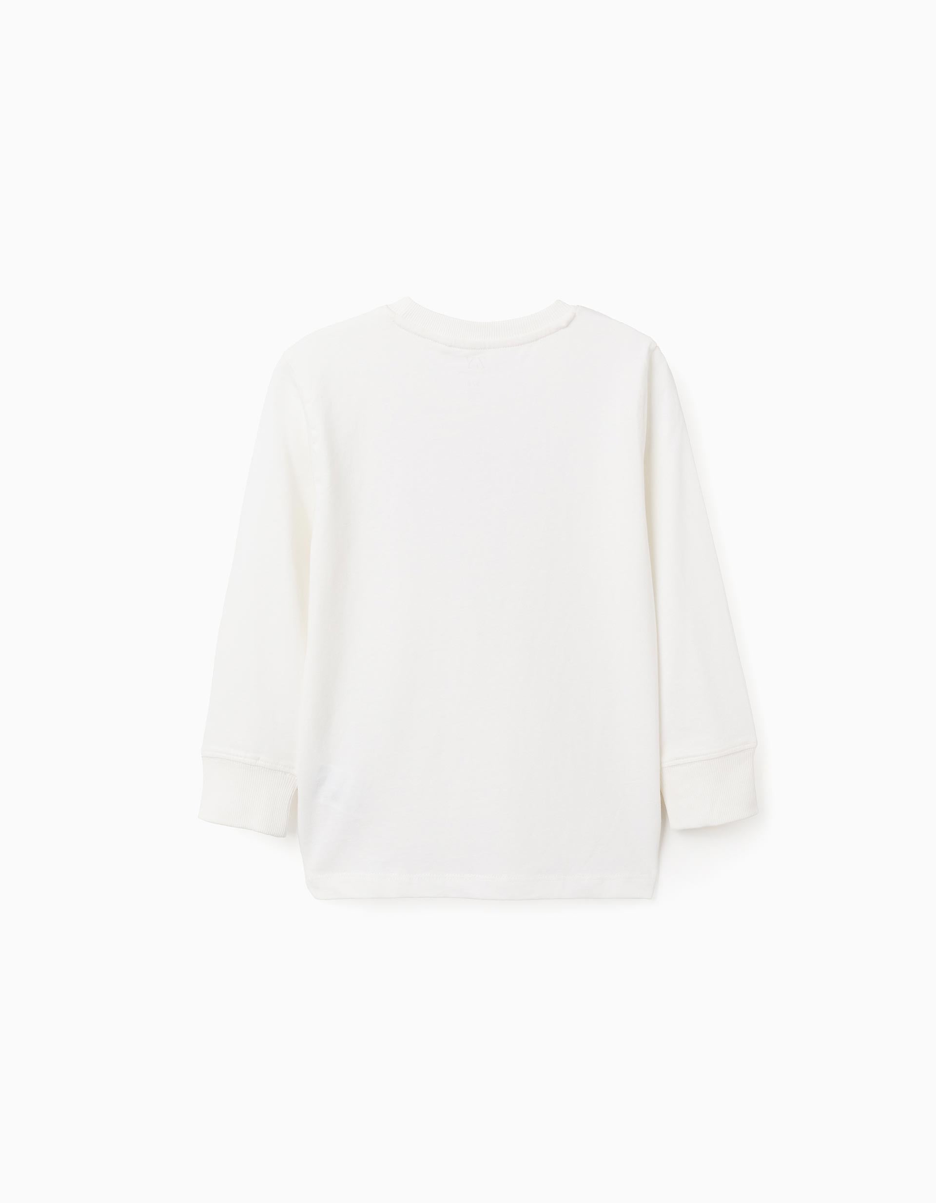 White long-sleeved T-shirt for boys, 100% cotton. Front embroidery and print. Ribbed collar and cuffs for a perfect fit. Printed inner label not to irritate the skin. A comfortable and cool T-shirt!