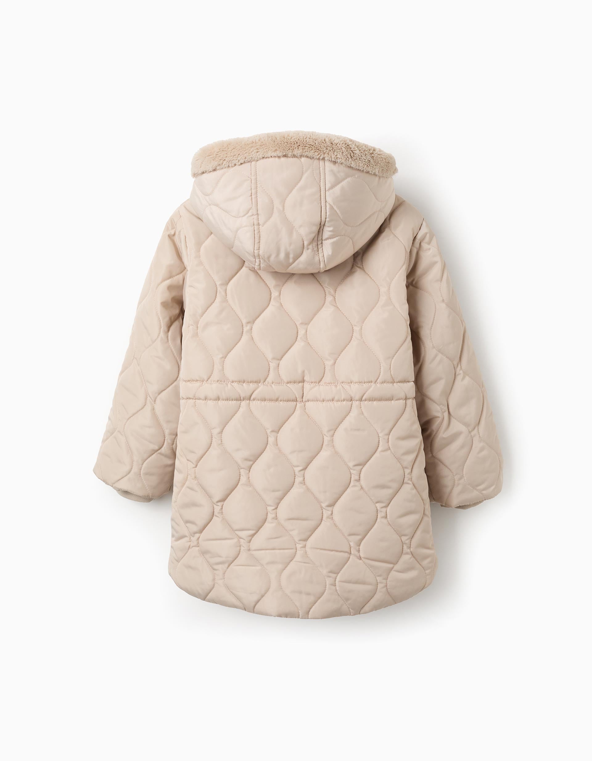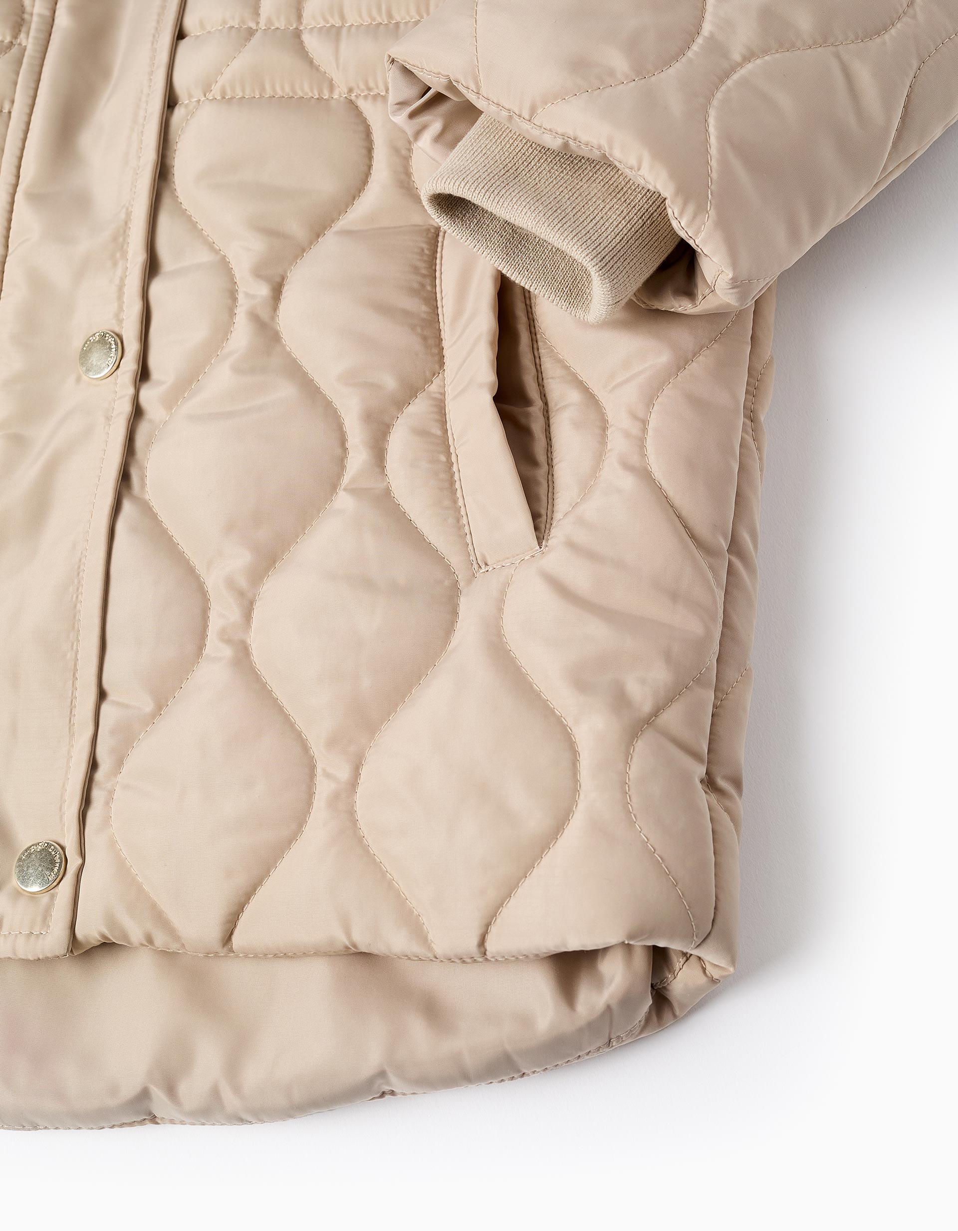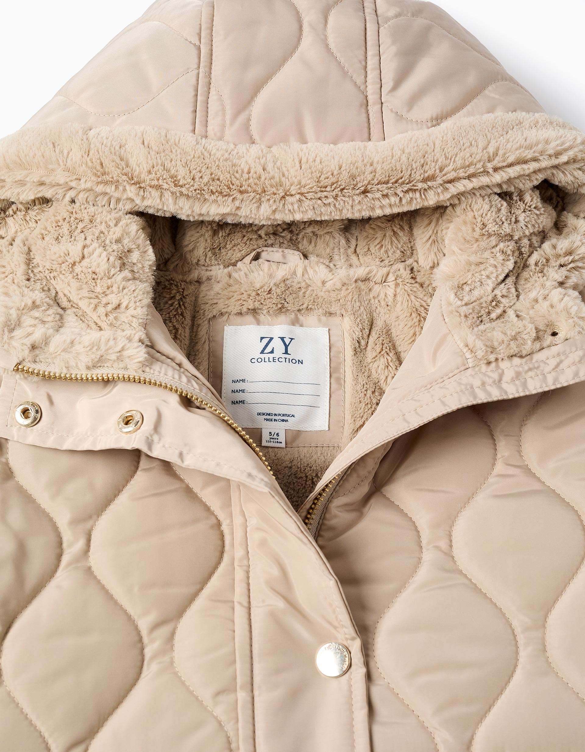 Beige medium-length quilted parka for girls, with hood. Soft and cosy faux fur lining. Side pockets. Fastens with zip and gold snap buttons for an elegant touch. Ribbed inner cuffs for a perfect fit. Inner label to write the child's name. We Care: the filling of this piece is made of recycled polyester. The ideal jacket for the colder months.