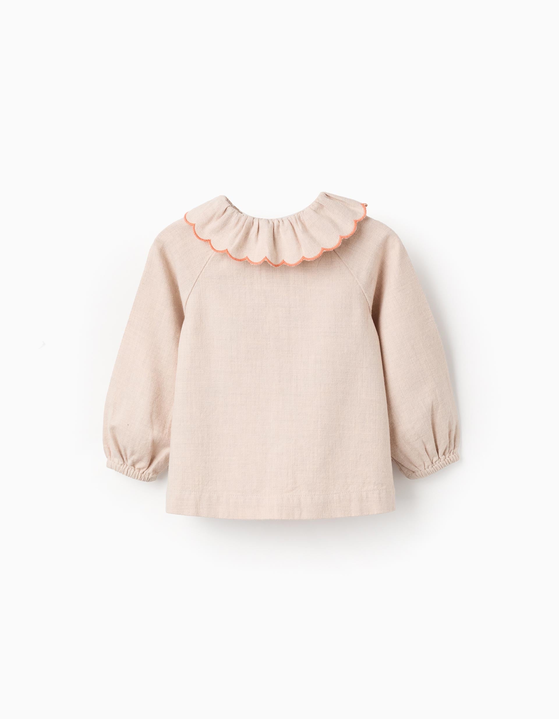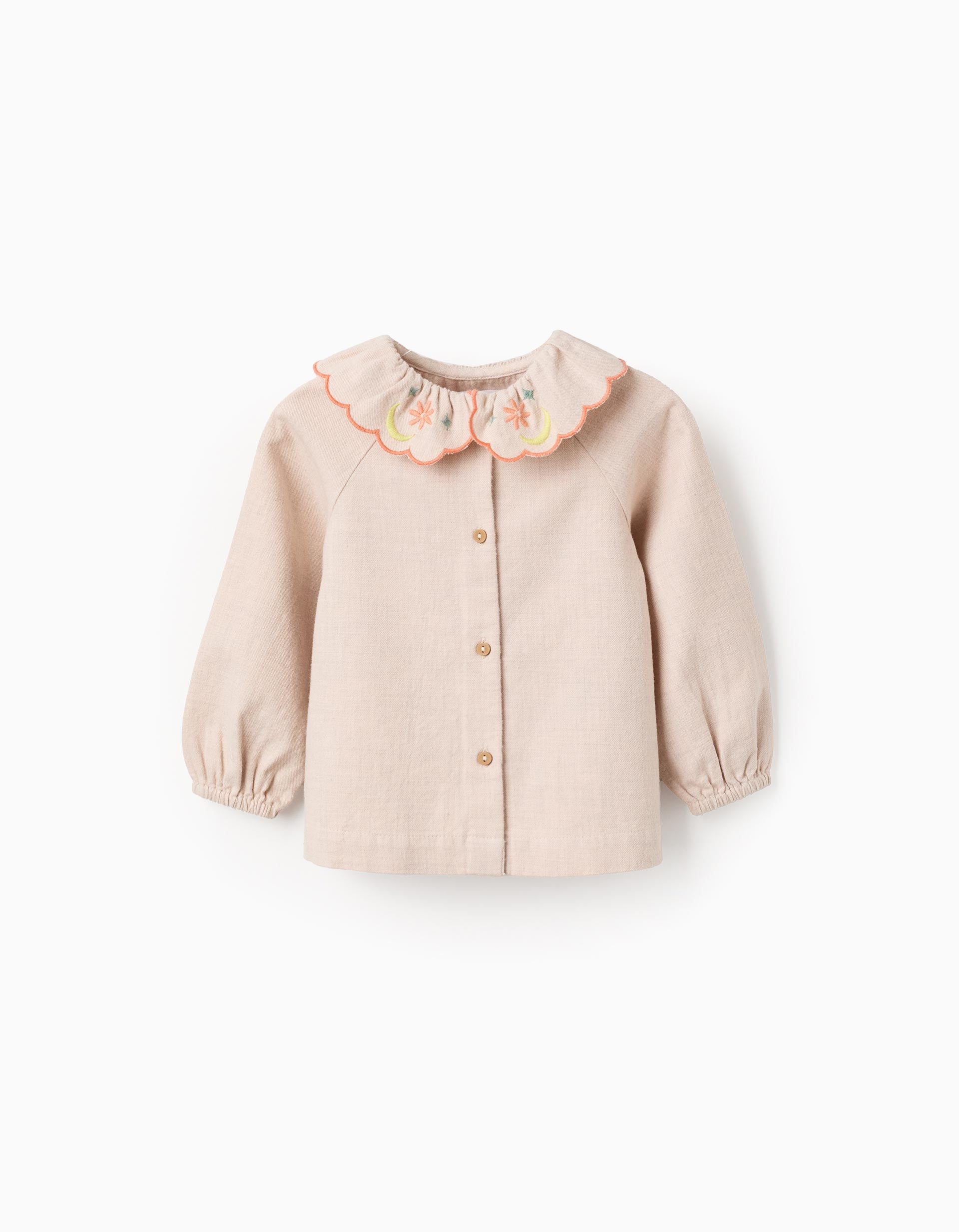 Beige twill shirt for baby girls, with colourful embroidery on the collar. Raglan sleeves with elasticated cuffs for a perfect fit. Button fastening. Evasé waistband. For original looks with a boho-chic touch!