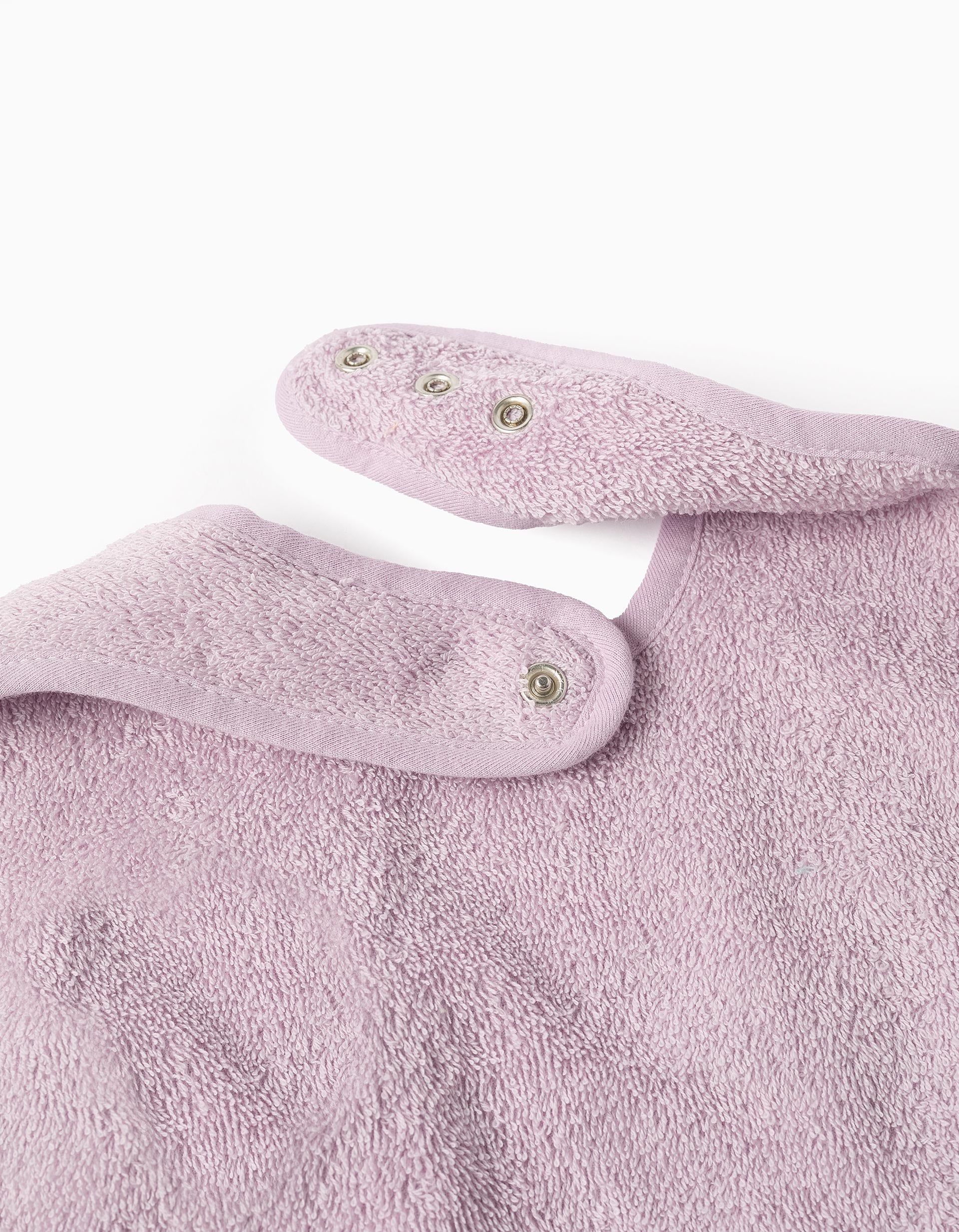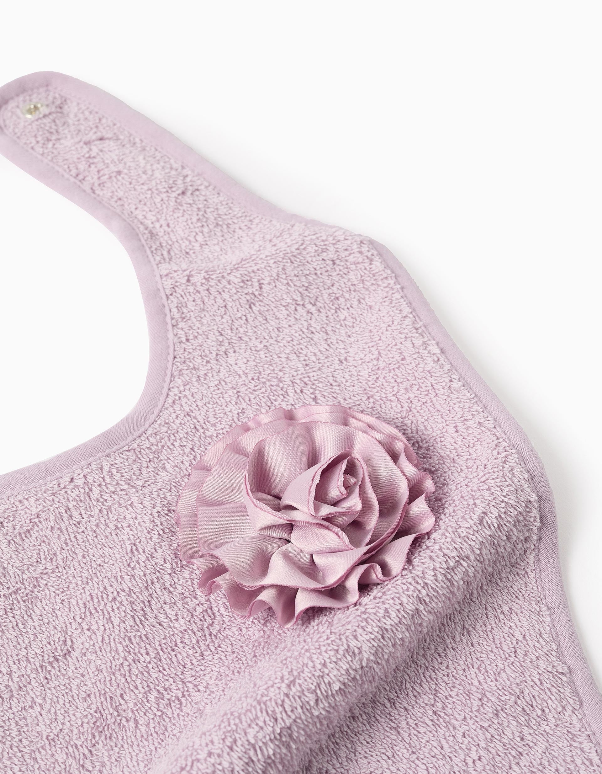 Fleece pink bib for baby, with 3D flower, made of 100% organic cotton. Soft, absorbent and original! Adjustable snap closure in 3 levels. Dimensions: 26.5 x 49.5 cm.