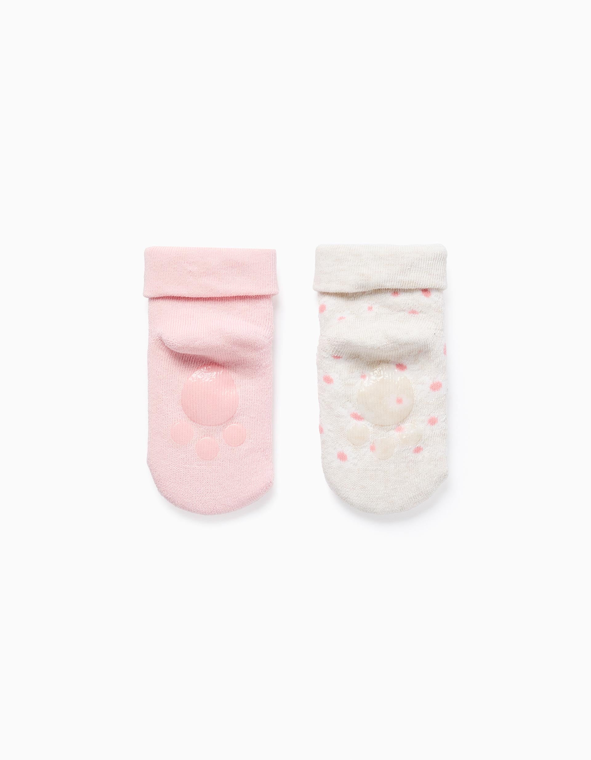 Pack of two pairs of non-slip socks for baby girls, in a soft and flexible cotton blend. With a terrycloth interior for extra comfort. Includes a pair of beige socks with a floral pattern and a pink pair with an animal jacquard. Anti-slip effect, ideal for wearing around the house! We Care: item certified Oeko-Tex Standard 100, which guarantees the absence of harmful or irritating substances for the skin. We Care: article with Oeko-Tex Standard 100 certification, which guarantees the absence of harmful or irritating substances for the skin.