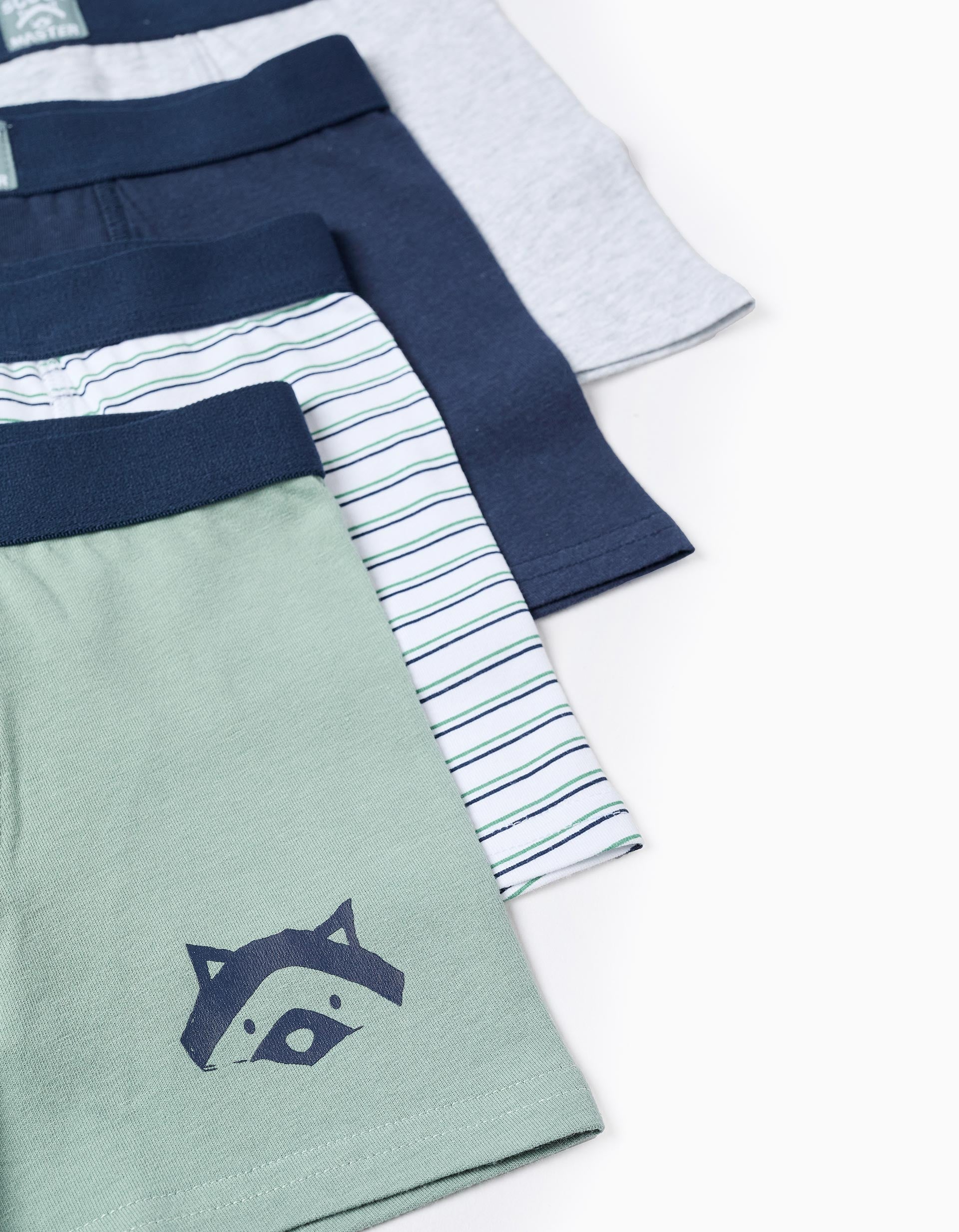 Pack of four boxer shorts for boys, in cotton with a touch of elastane for greater comfort and freedom of movement. Includes boxer shorts in shades of white, grey, green, and dark blue, three plain and one with a striped pattern. Waistband with elastic for a perfect fit. Practical and versatile, perfect for ensuring daily comfort.
