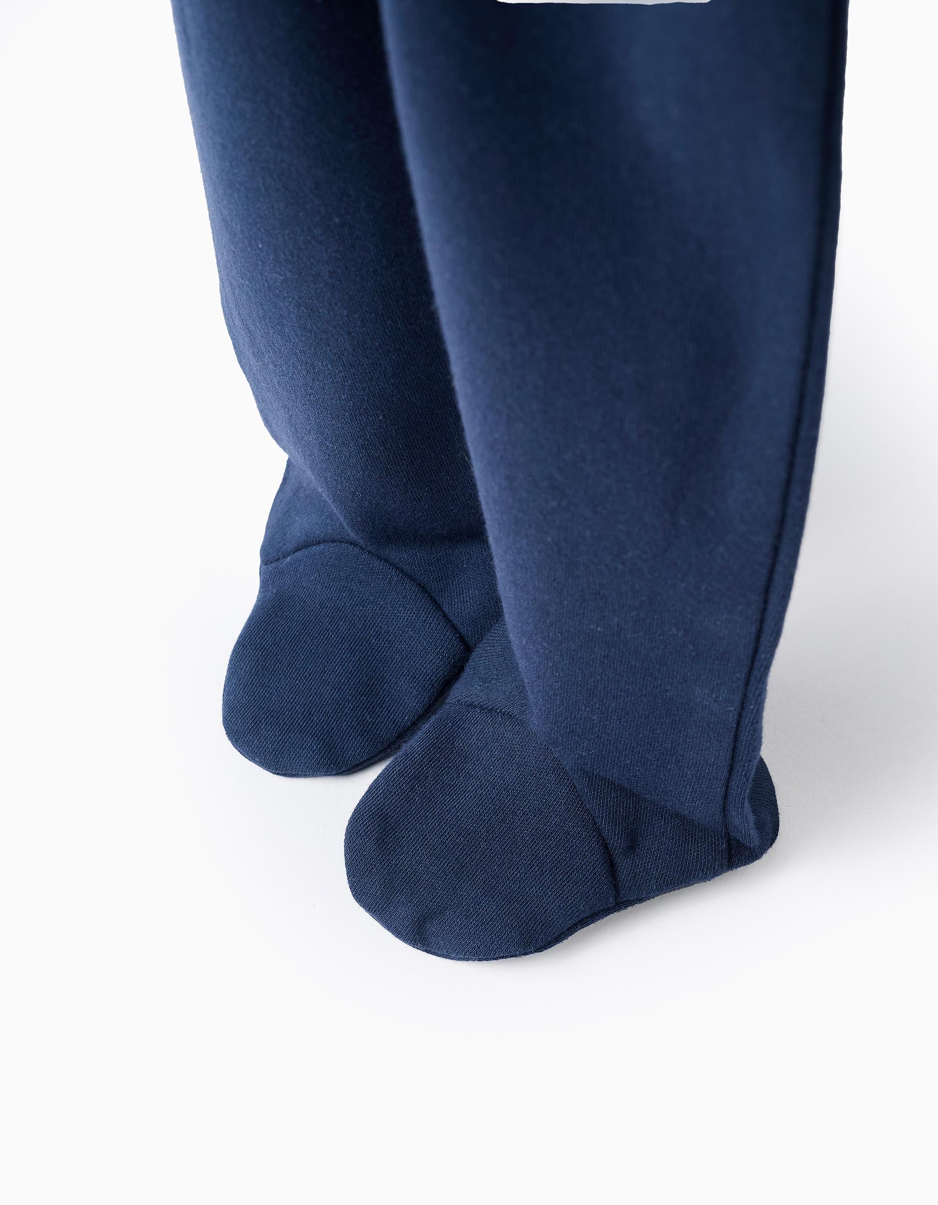 Pack of four trousers with feet in shades of white and dark blue for newborns and babies, 100% cotton. Includes one plain pair and three with motifs: stripes, bows and hearts. High-waisted, foldable and with soft elastic so as not to press on the sensitive navel area. Printed inner labelling so as not to irritate the skin. A set of garments labelled "extra comfy", essential for babies' daily lives and perfect for wearing under pyjamas.
