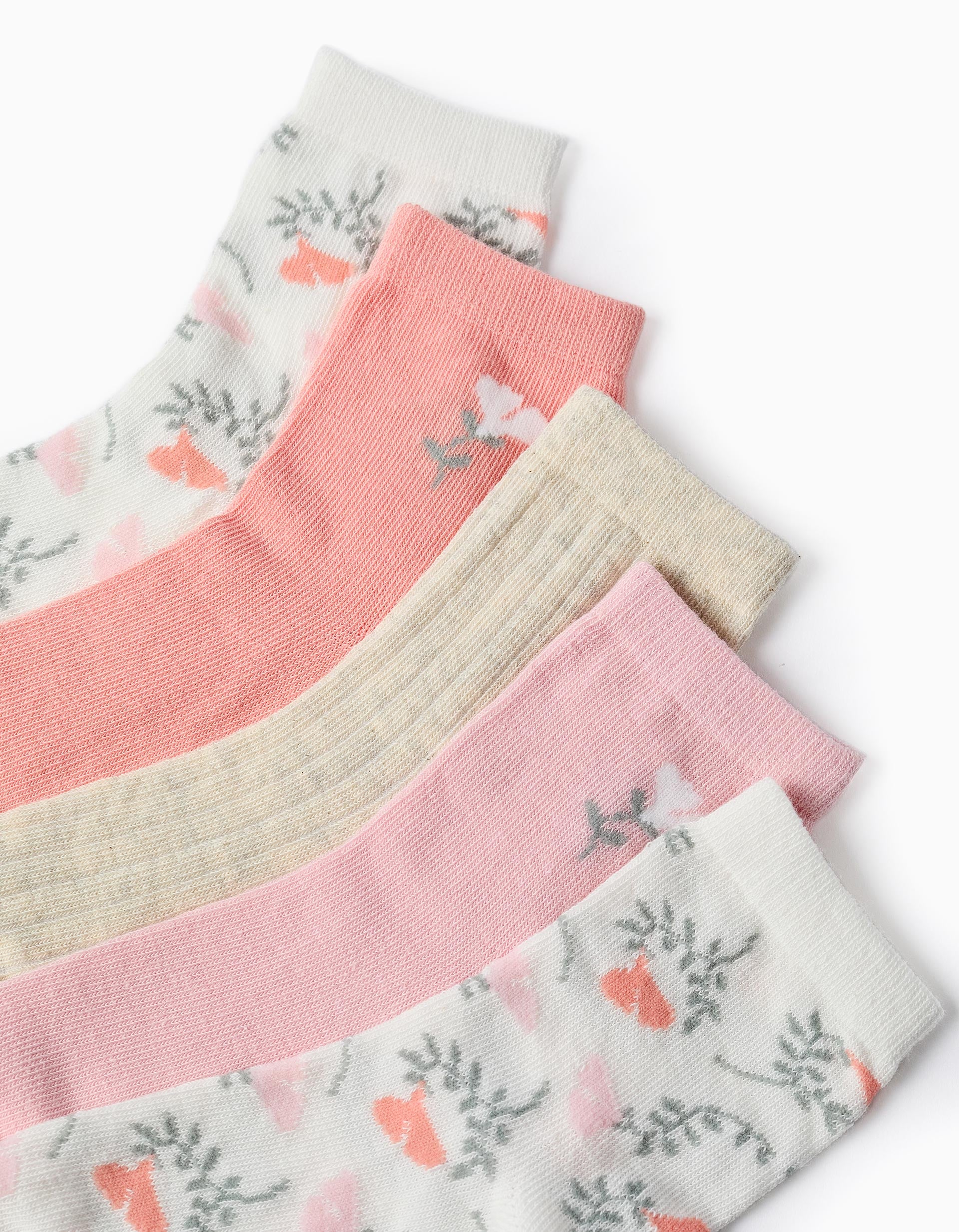 Pack of five pairs of socks for girls, in a cotton and elastane blend, for greater comfort and a perfect fit. Includes socks in shades of white, pink, beige, and coral, plain, ribbed, or with flowers. Perfect for everyday wear. We Care: item with Oeko-Tex Standard 100 certification, which guarantees the absence of harmful or irritating substances for the skin.