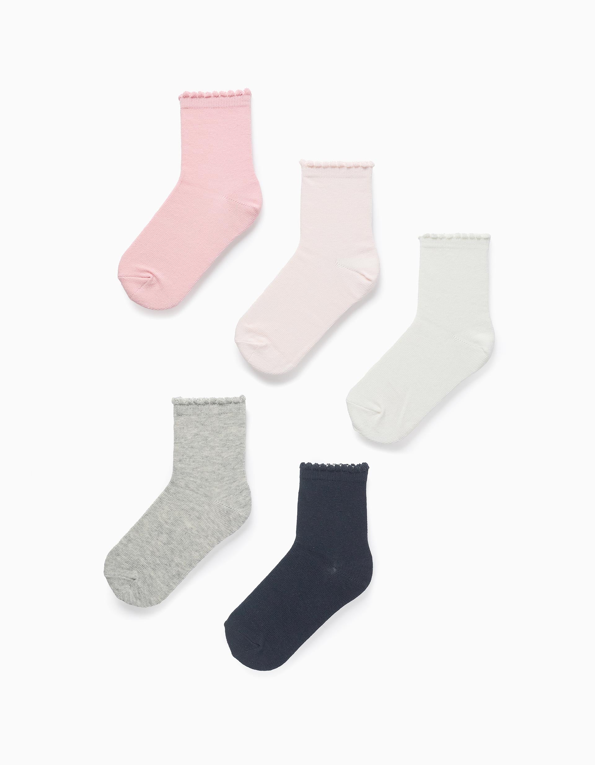 Pack of five pairs of socks for girls, in a cotton and elastane blend, for greater comfort and a perfect fit. In shades of pink, blue, white and grey, plain and with a wavy cuff. A pack of flexible and comfortable socks, perfect for any occasion. We Care: item with Oeko-Tex Standard 100 certification, which guarantees the absence of harmful or irritating substances for the skin.