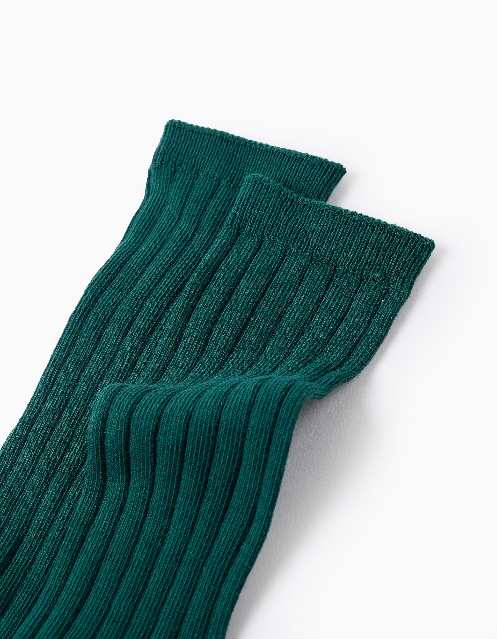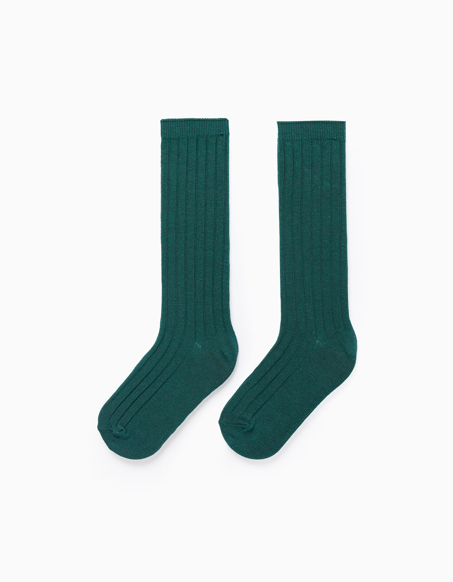 Dark green high socks for boys. In a cotton and elastane blend for greater comfort and freedom of movement. Ribbed effect. Comfortable and stylish, these socks are ideal for wearing with shorts. We Care: item with Oeko-Tex Standard 100 certification, which guarantees the absence of harmful or irritating substances for the skin.