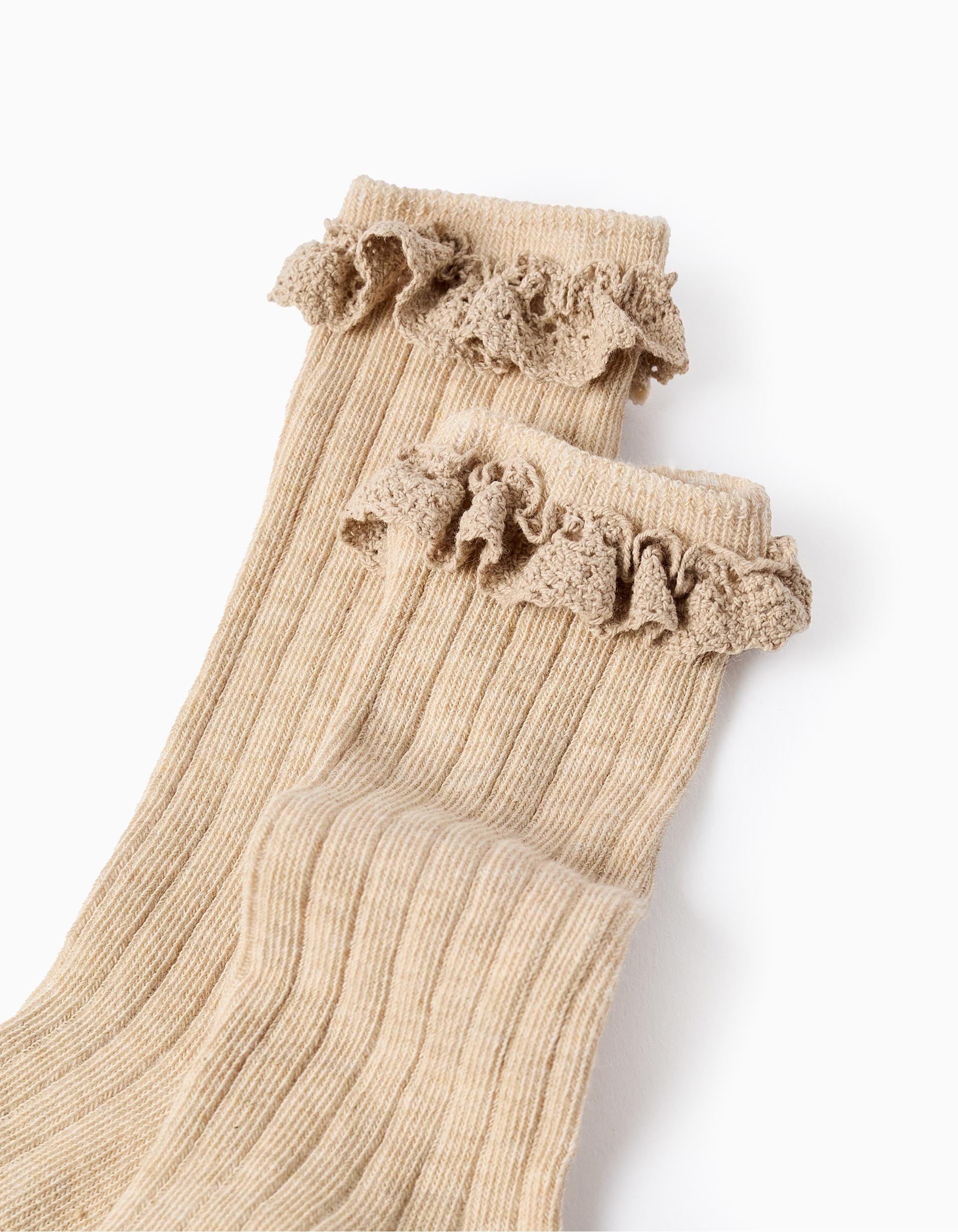 Beige ribbed high socks for baby girls, in a cotton blend. Crochet ruffles at the top. Knee length. A comfortable pair of socks to finish off classic looks. We Care: item with Oeko-Tex Standard 100 certification, which guarantees the absence of harmful or irritating substances for the skin.