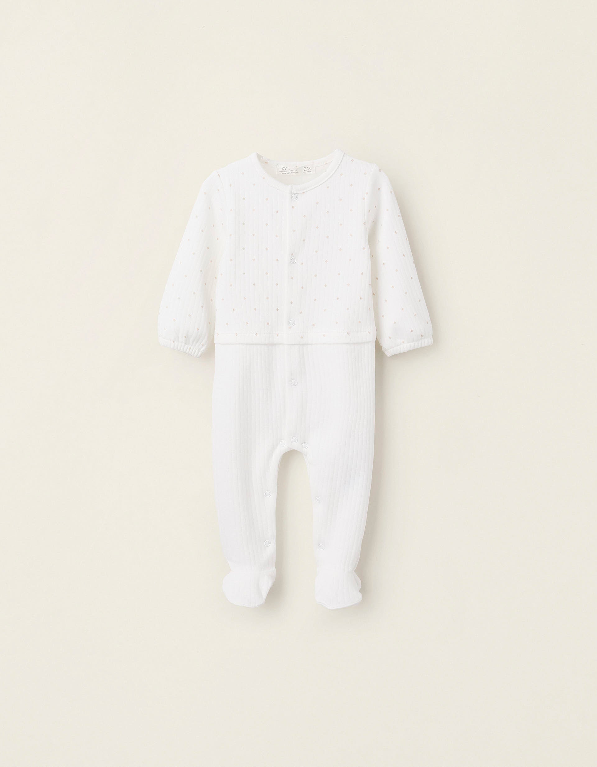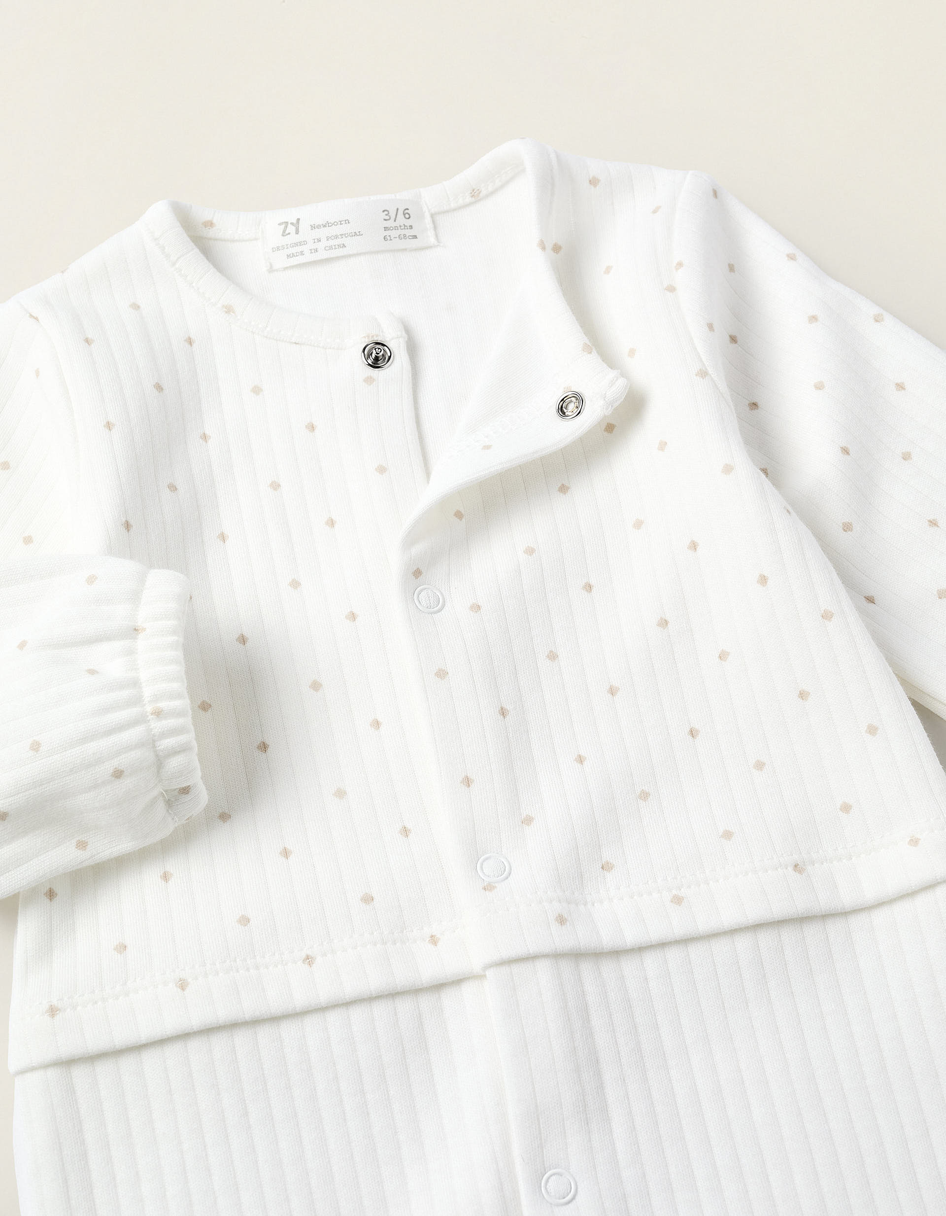 Ribbed white sleepsuit for newborn girls, 100% cotton. Diamond pattern on the chest. Snap buttons in the centre and at the crotch, with a coloured snap button to use as a reference when dressing. Elastic at the heel for a perfect fit. A soft and comfortable sleepsuit, ideal for the mid-season.