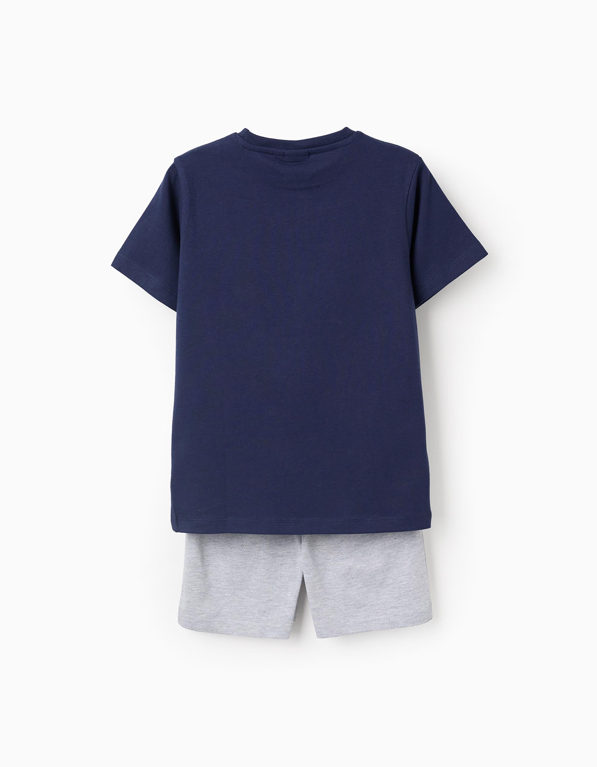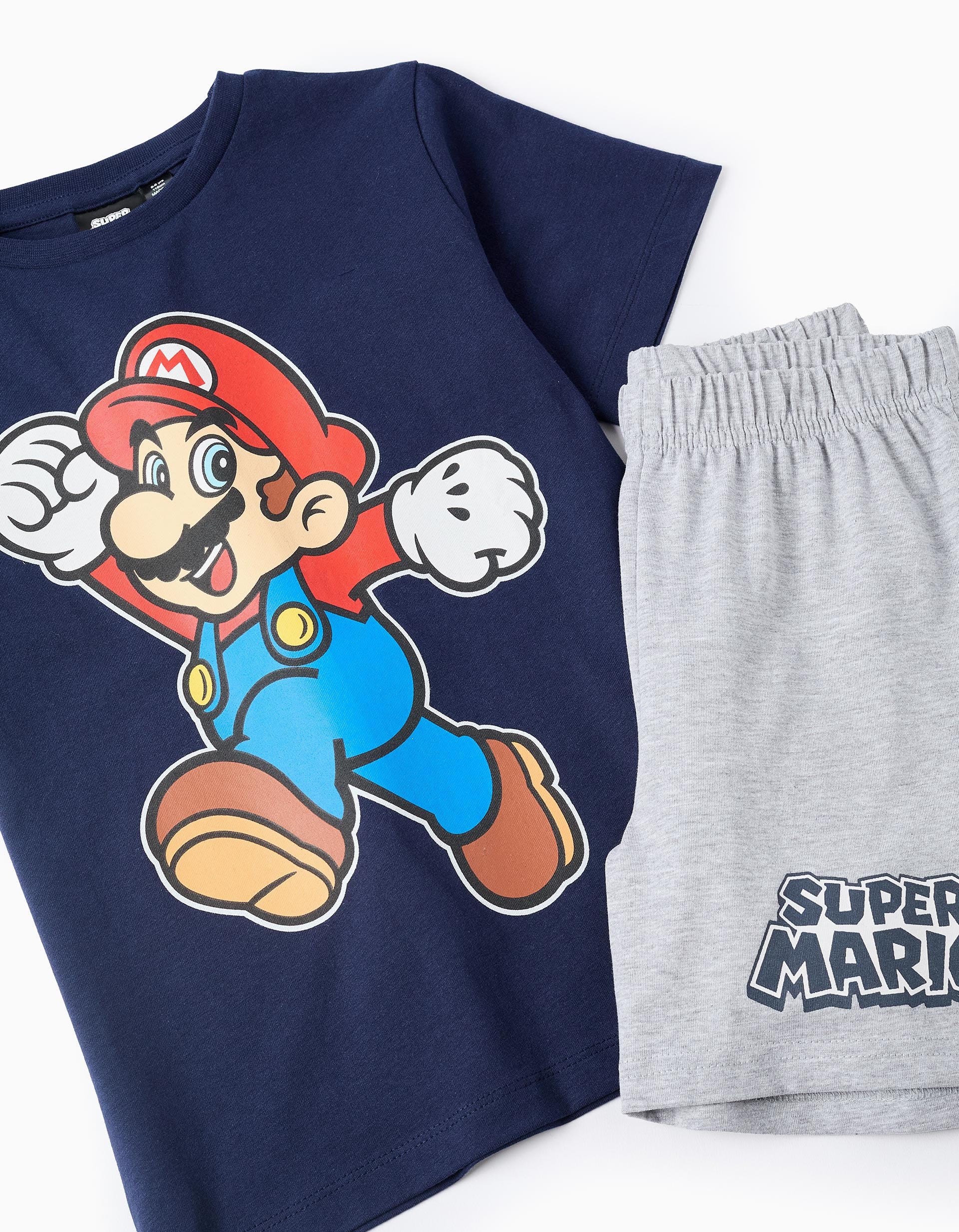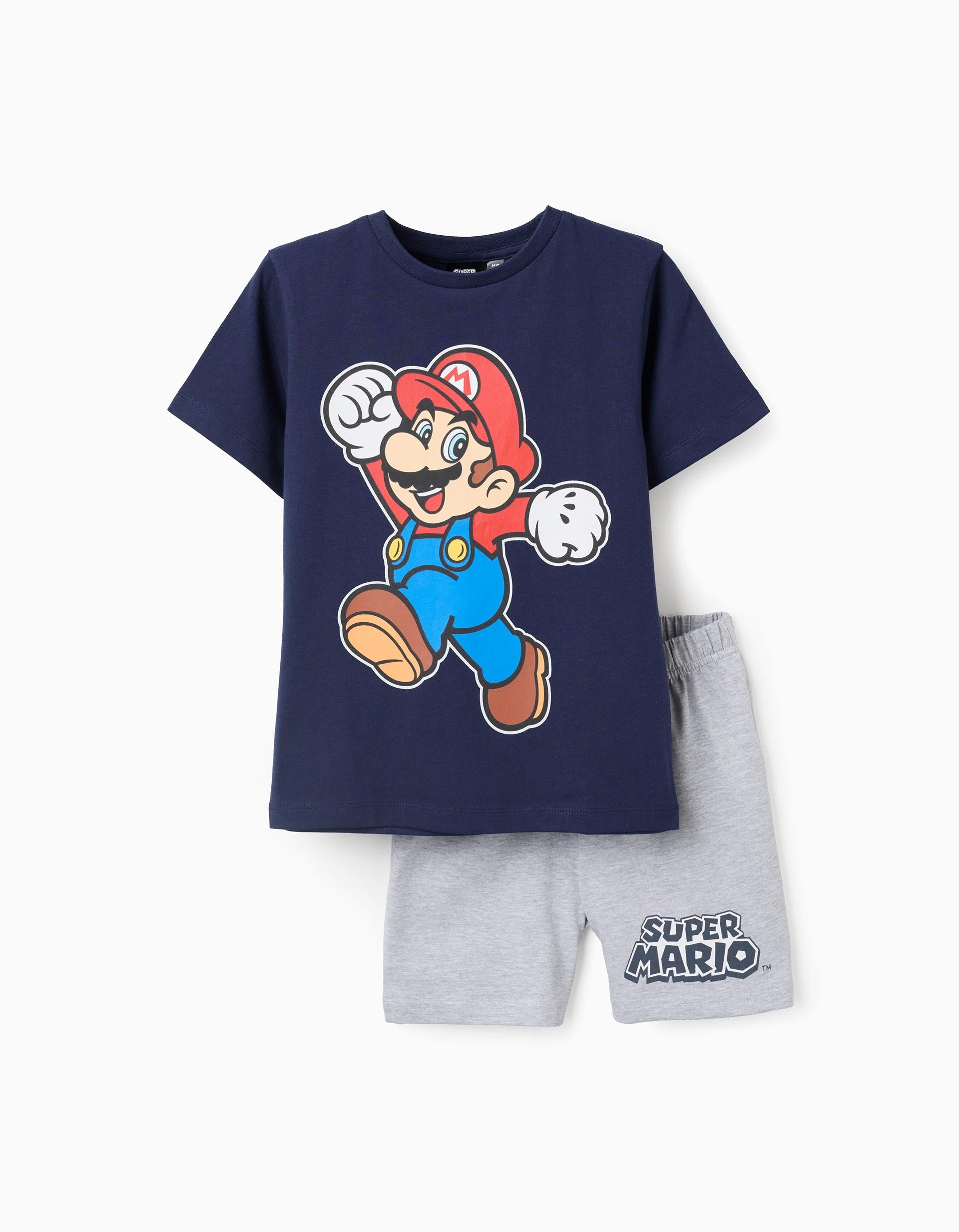 Two-piece pyjama for boys, 100% cotton. Includes a dark blue t-shirt with a front print of Super Mario; and plain grey shorts with detail. A comfortable pyjama, perfect for spring-summer nights!