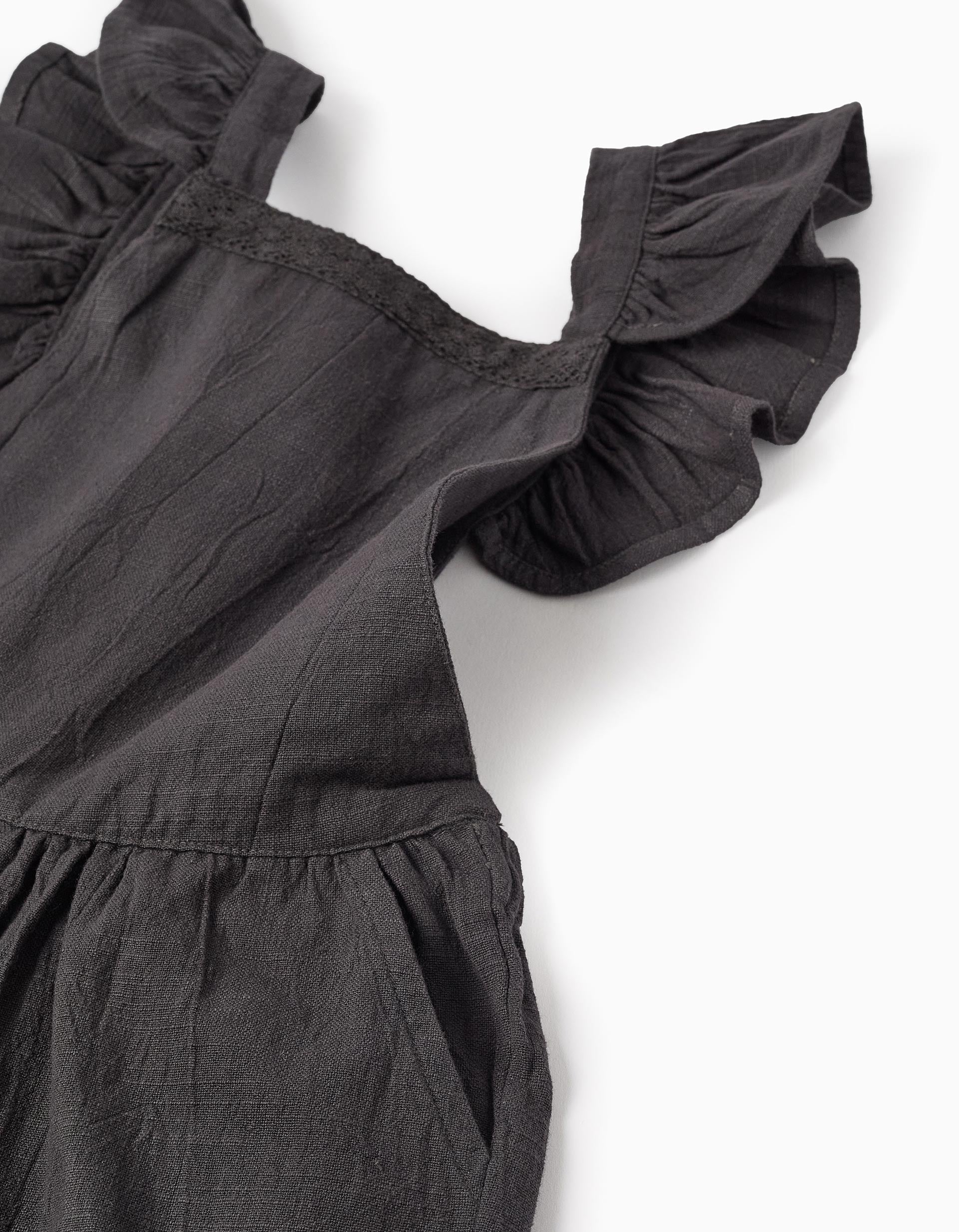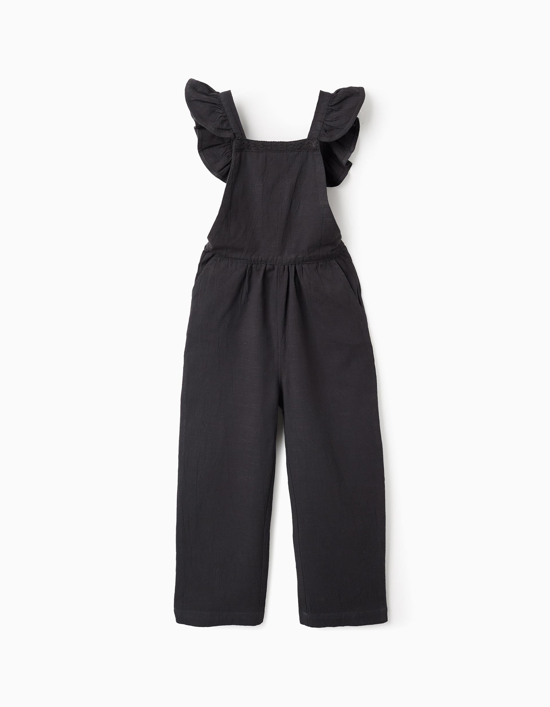 Dark grey dungarees for girls, made from 100% slub cotton. Top with crochet detail on the chest and adjustable ruffled straps at the back. Open back. Elastic and comfortable waistband. Side pockets. Straight fit. An elegant and original jumpsuit!