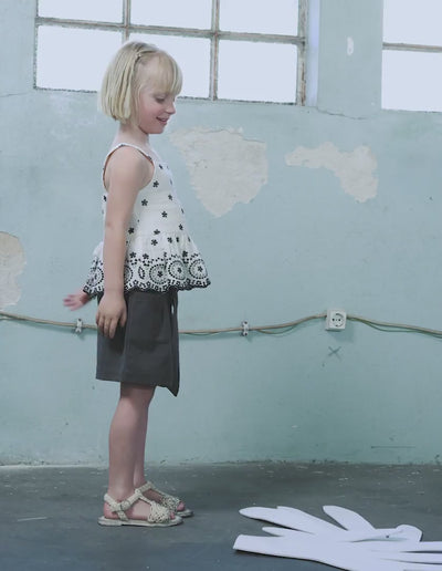 Dark grey shorts for girls, made from 100% slub cotton. Pockets with crochet details. Adjustable inner waistband with elastics and buttons, with integrated ties. An elegant and original pair of shorts!