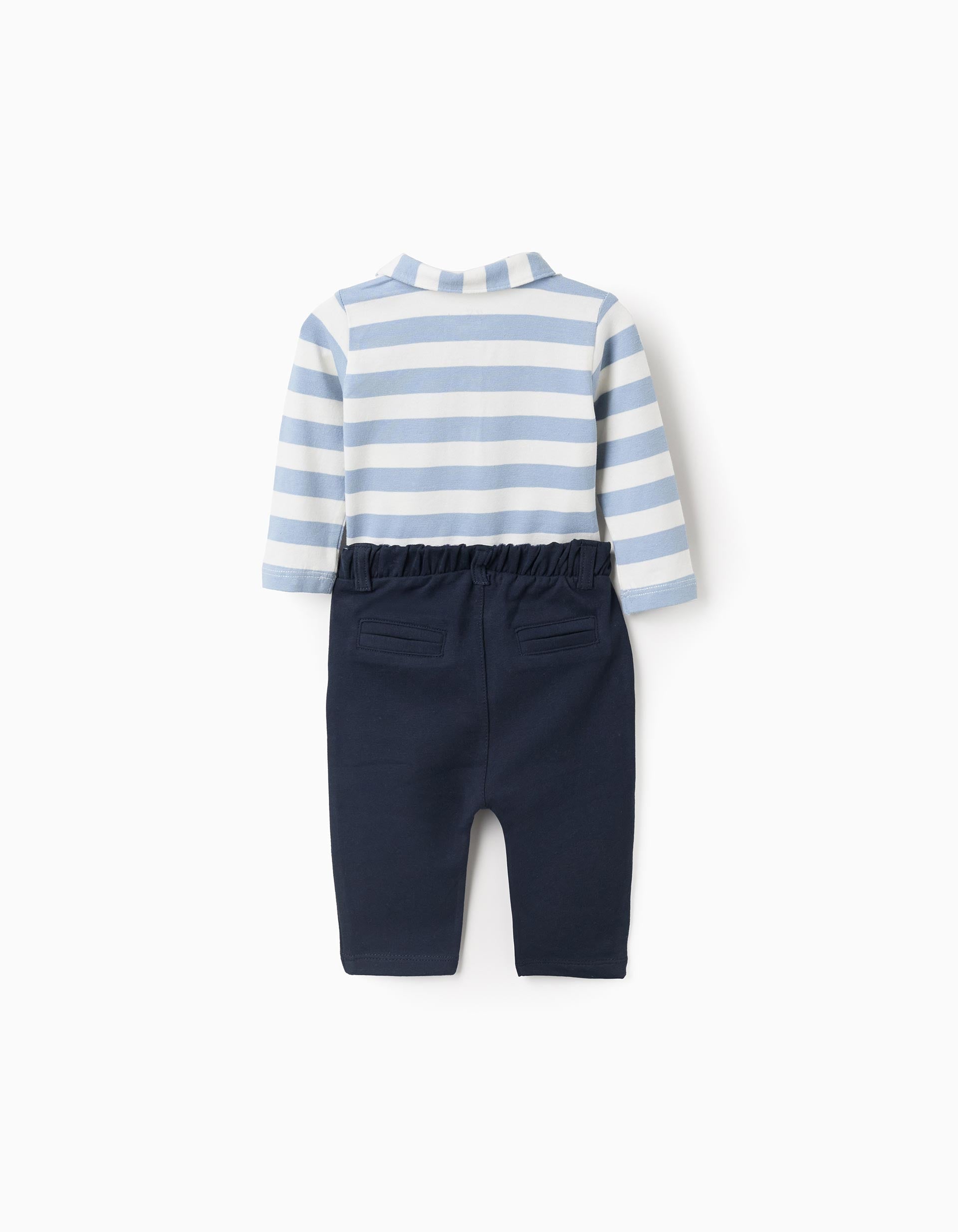 Two-piece set for newborns. It includes a white and light blue striped bodysuit with a Peter Pan collar; and a pair of dark blue jersey trousers. A practical and comfortable set for adorable mini-adult looks!