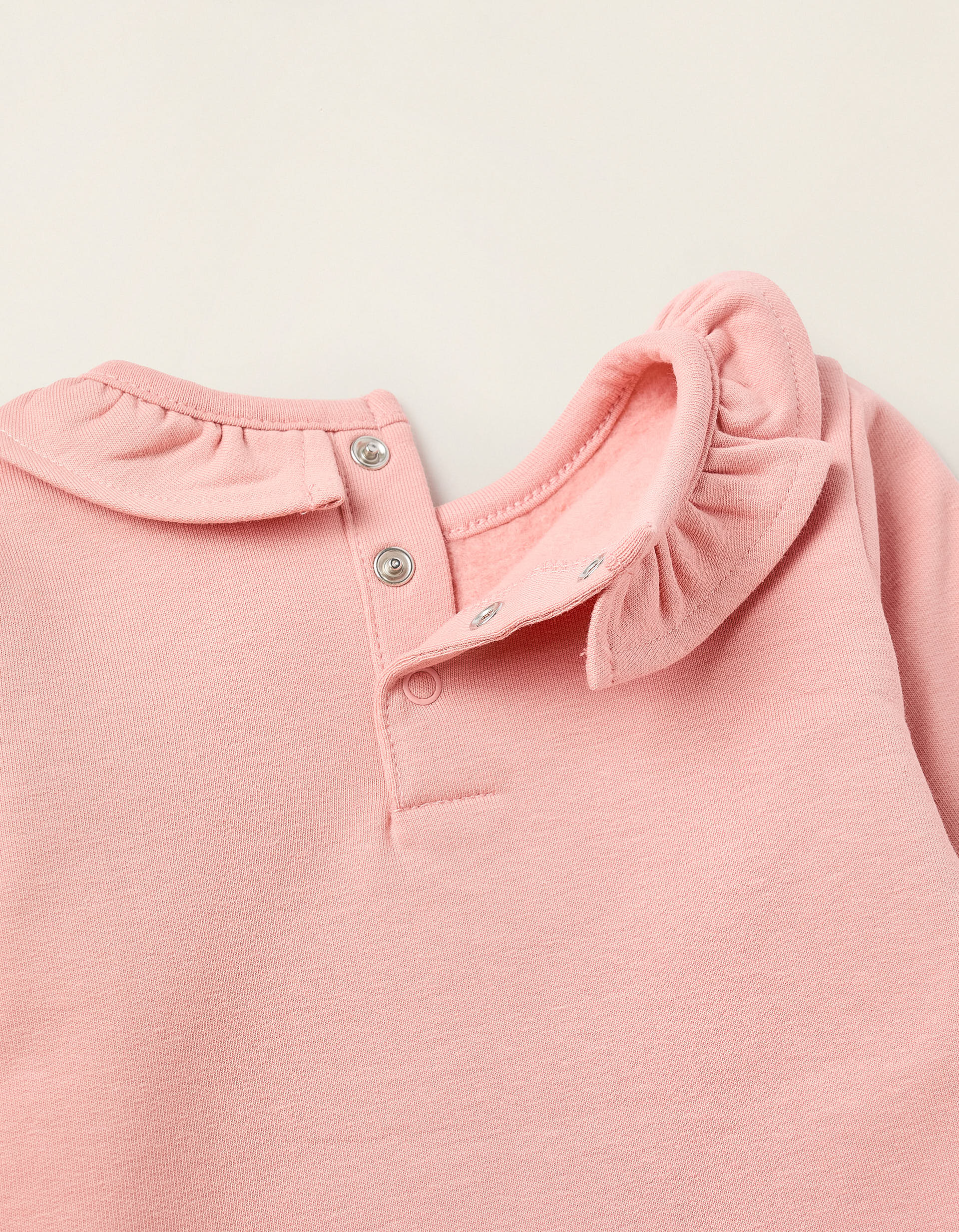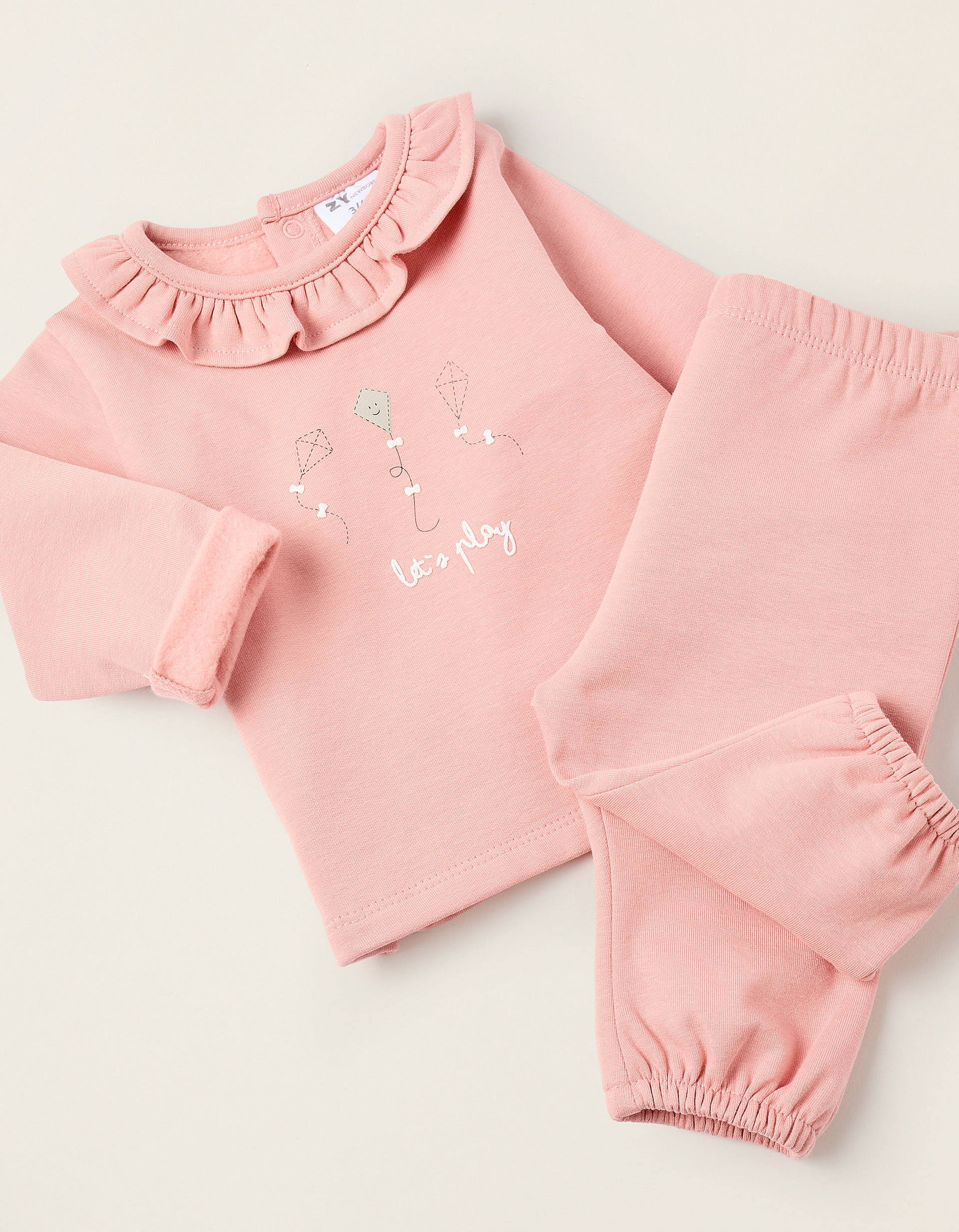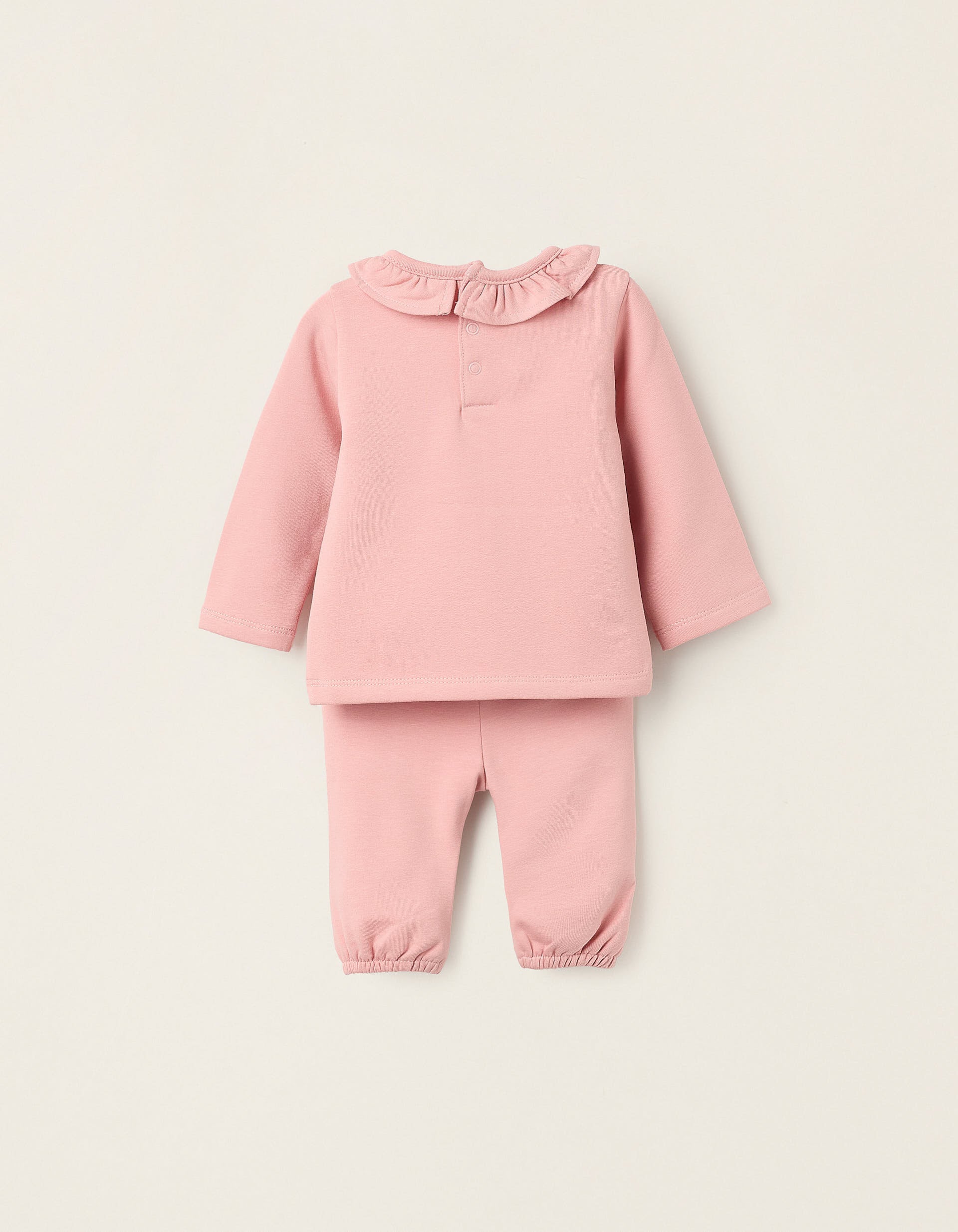 Two-piece set for newborn girls, with brushed interior for greater thermal comfort. Includes a sweatshirt with front print and frilled collar, with snap buttons on the back for easy dressing; and matching trousers, with elastic waist and hems. A practical and cosy set!