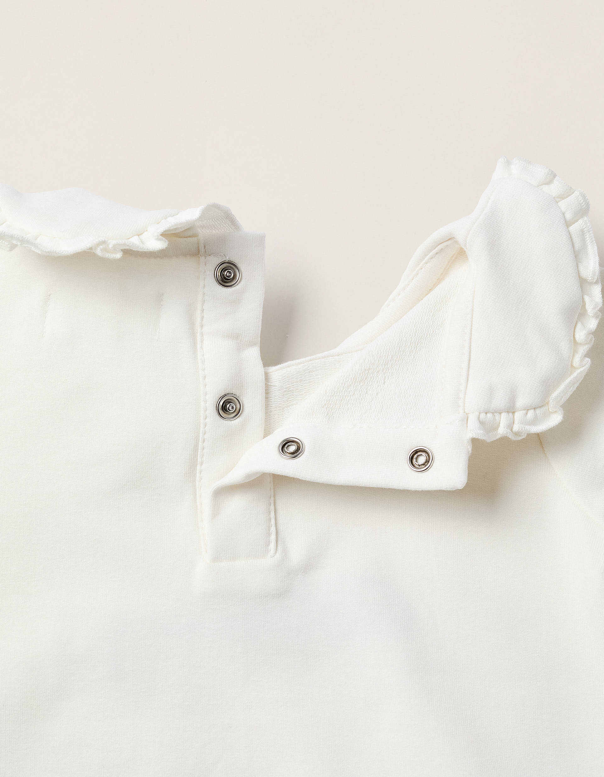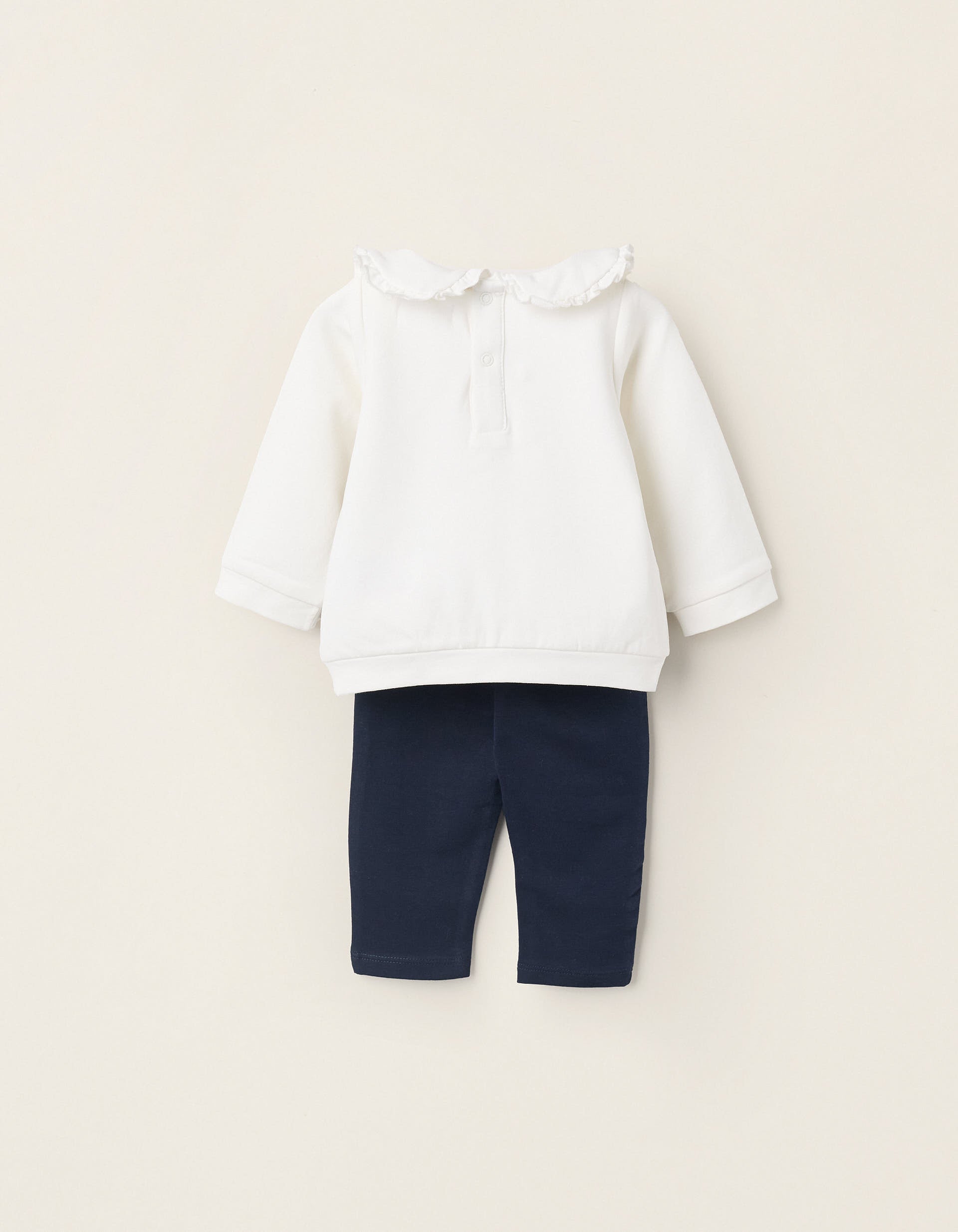 Two-piece set for newborn girls. It includes a white sweatshirt with front embroidery. Peter Pan collar with frill trim. Buttons at the back for easy dressing. It also includes a pair of plain, flexible dark blue trousers with an elastic and comfortable waistband. A set that can be worn together or separately with other pieces!