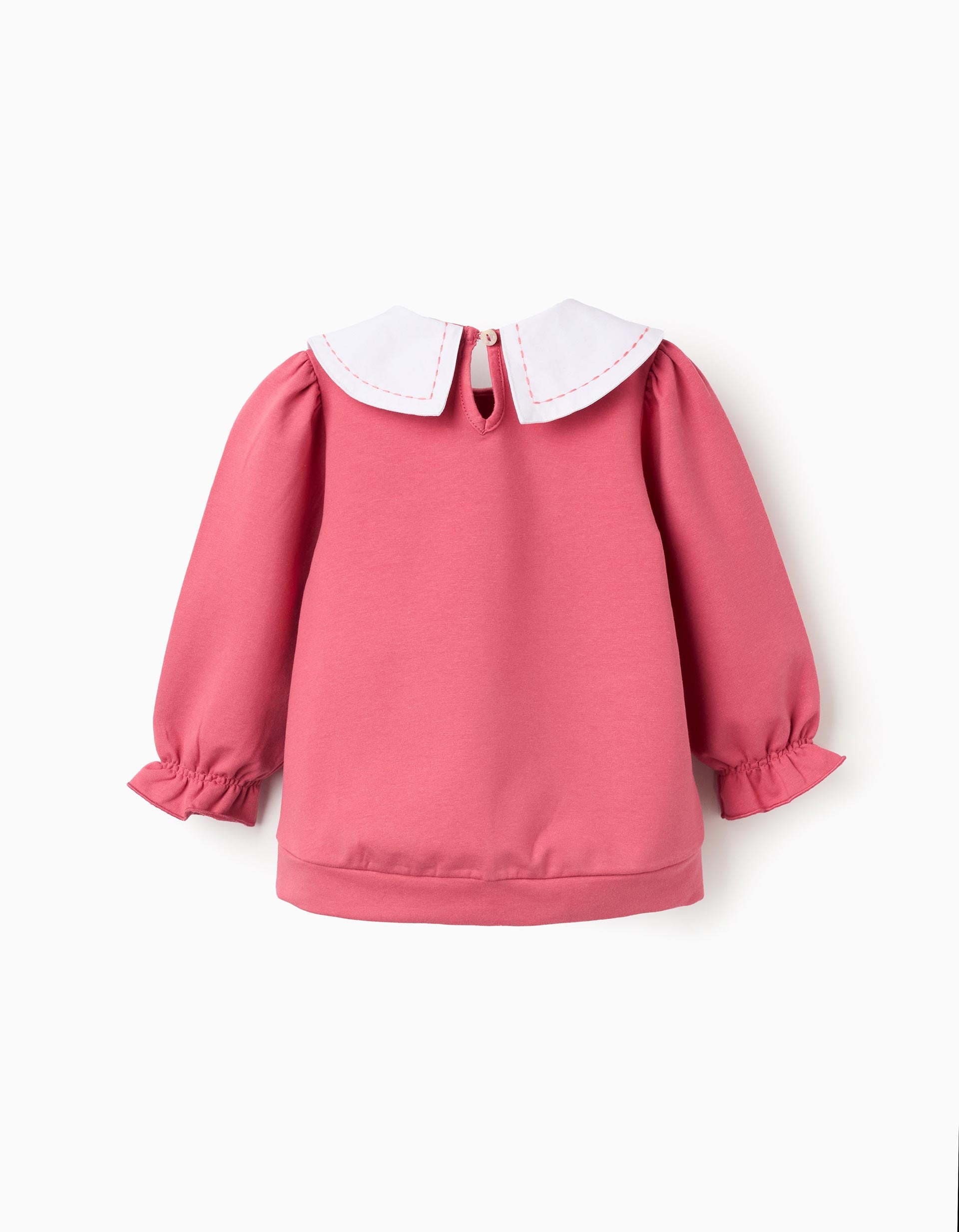 Pink sweatshirt for baby girls, in cotton with a touch of stretch for greater comfort and freedom of movement. White Dutch collar. Front embroidery. Slightly puffed sleeves, with gathered shoulders and wavy elastic cuffs. Button at the back for easy dressing. A comfortable and feminine option!