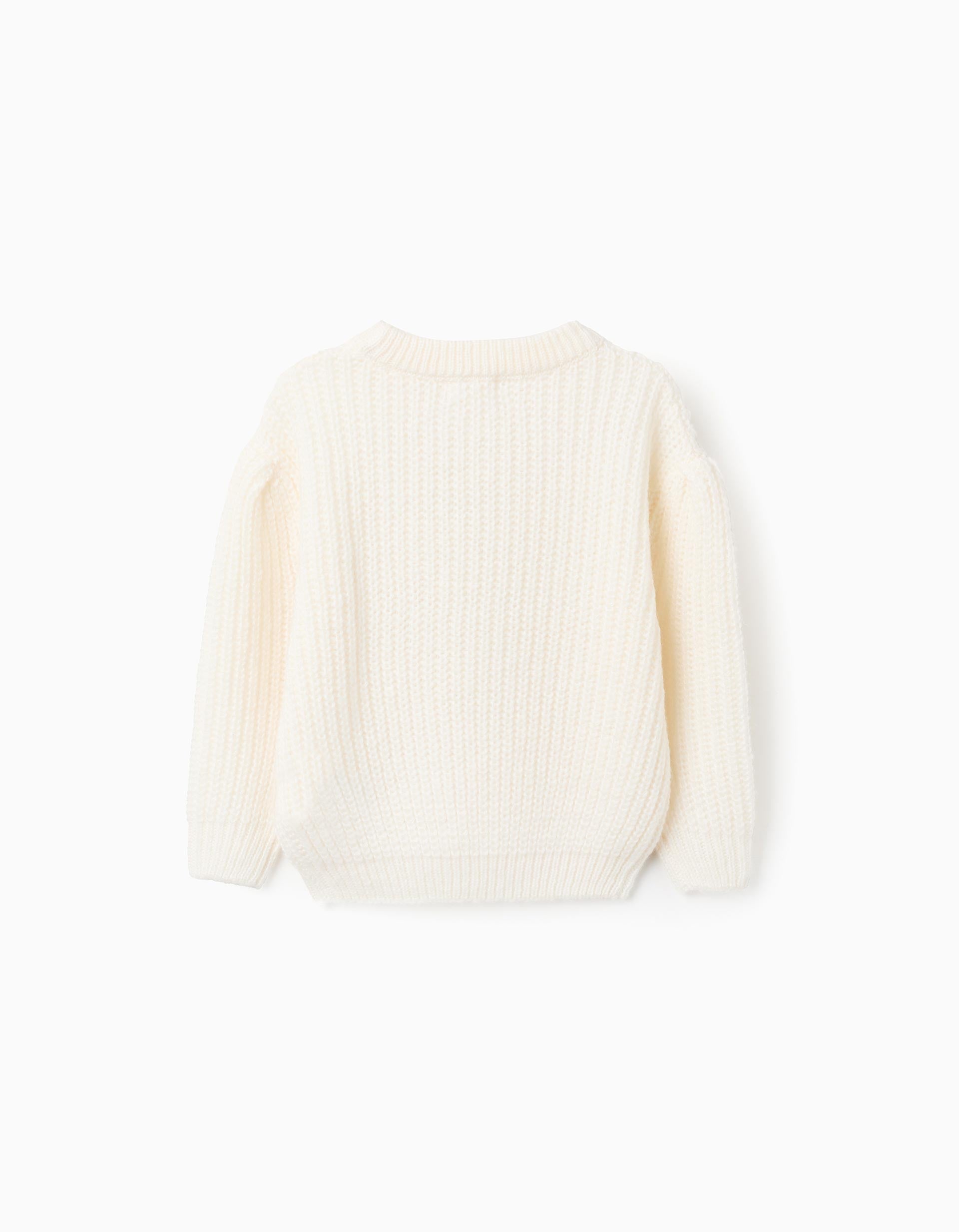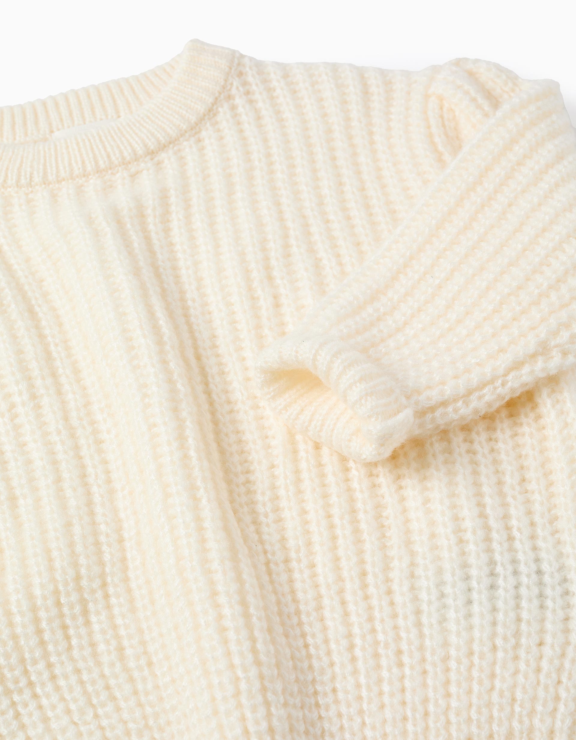 Light beige chunky knitted jumper for girls, 100% acrylic. Drop shoulders and slightly puffed sleeves. Ribbed edges. A versatile and cozy option!
