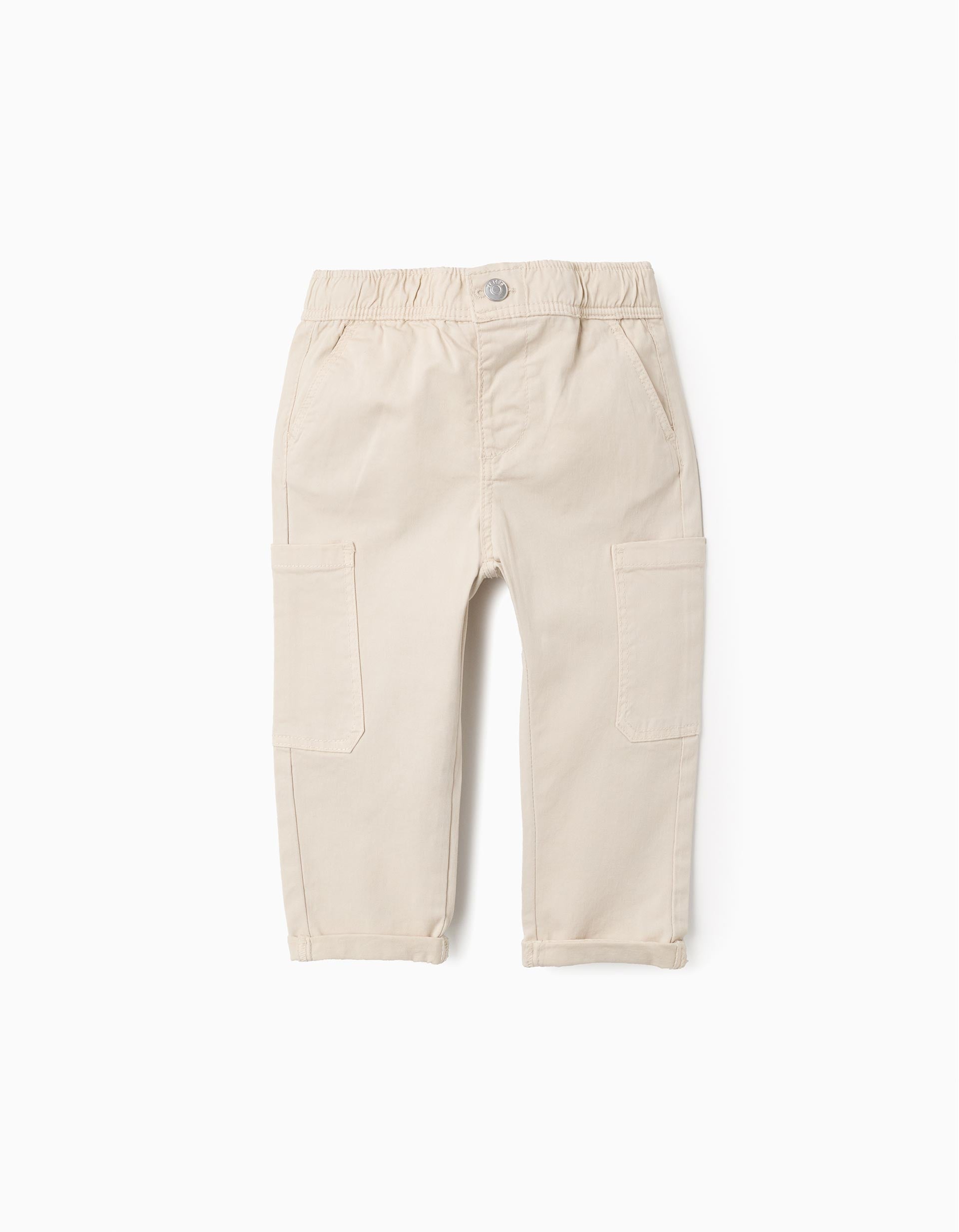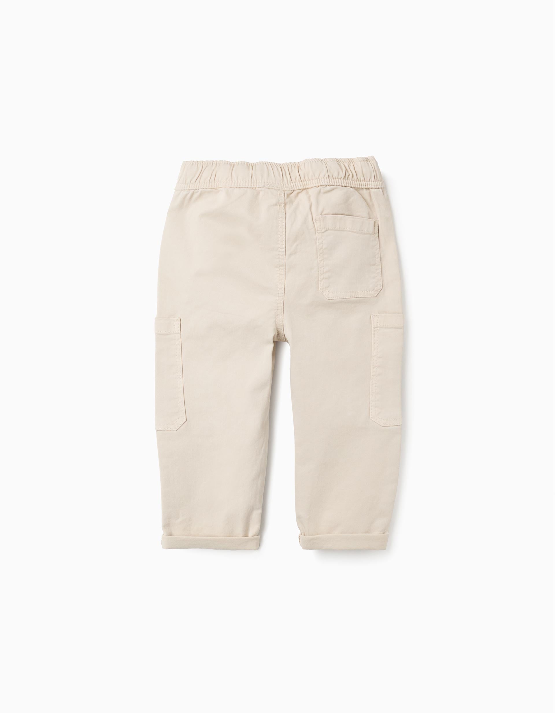 Beige cargo trousers for baby boys, made from cotton twill with a touch of stretch for greater comfort and freedom of movement. Includes two side pockets, two cargo pockets, and one back pocket. Elasticated and comfortable waistband, adjustable on the inside with elastics and buttons. For a relaxed and comfortable style!