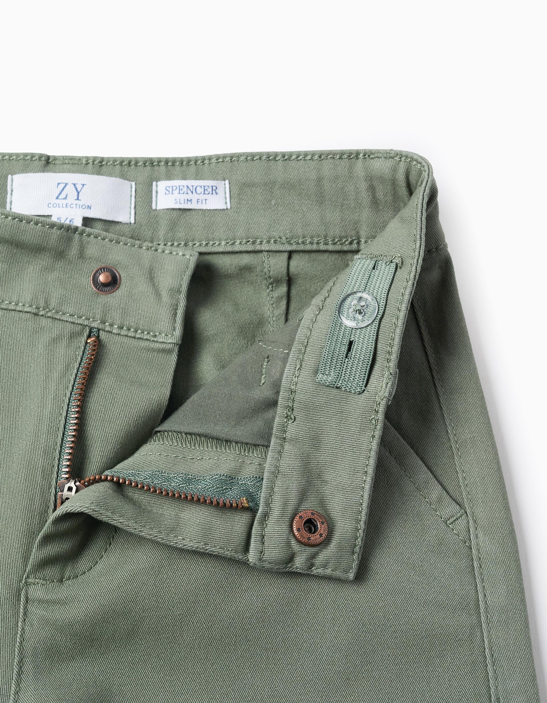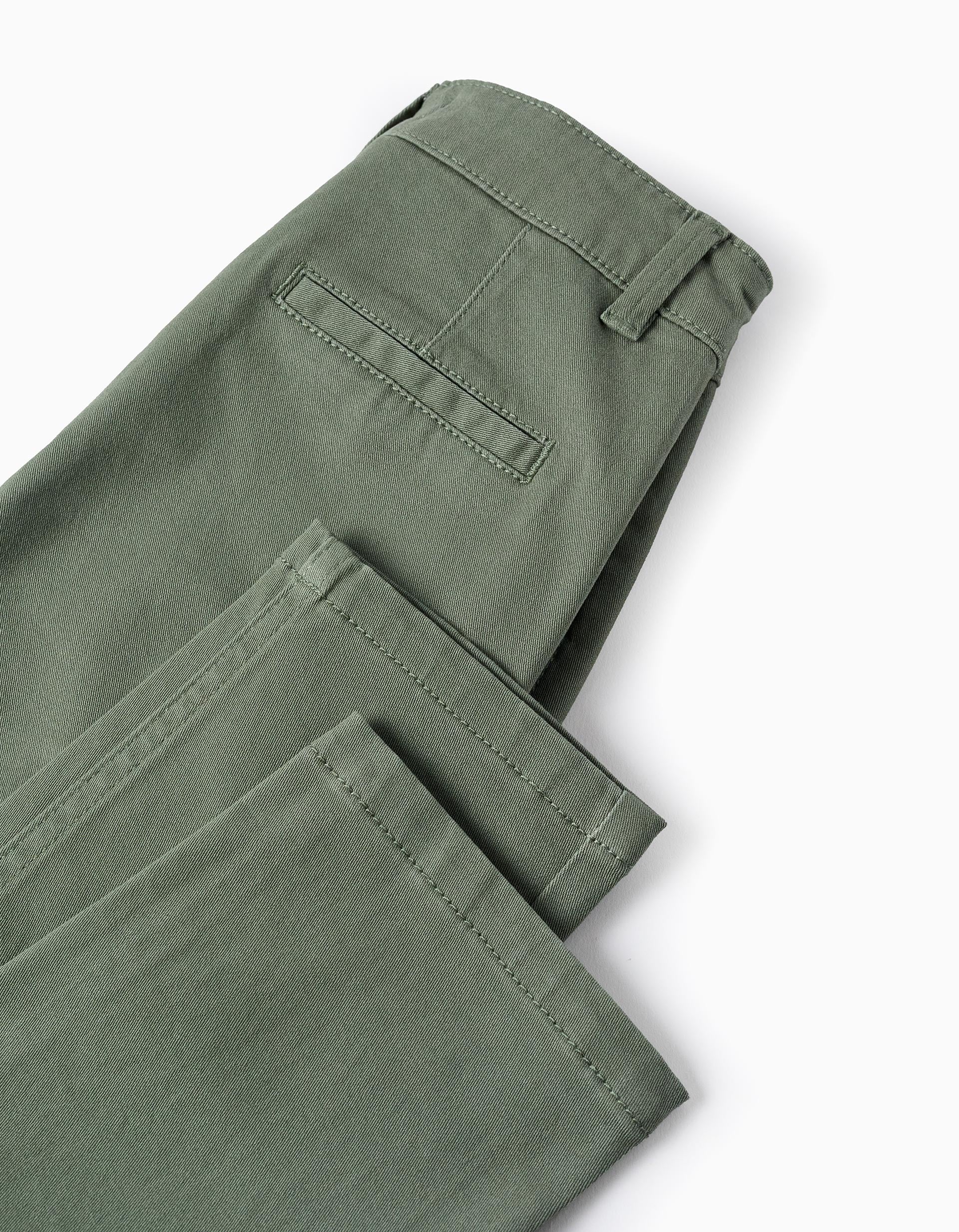 Green twill chino trousers for boys, made of cotton with a touch of stretch for greater comfort and freedom of movement. Slim fit. Functional side pockets and decorative back pockets. Adjustable waist on the inside. A wardrobe classic! Big Me: fastens with a snap button under a decorative button up to size 8/9, to make dressing easier and promote your child's independence.