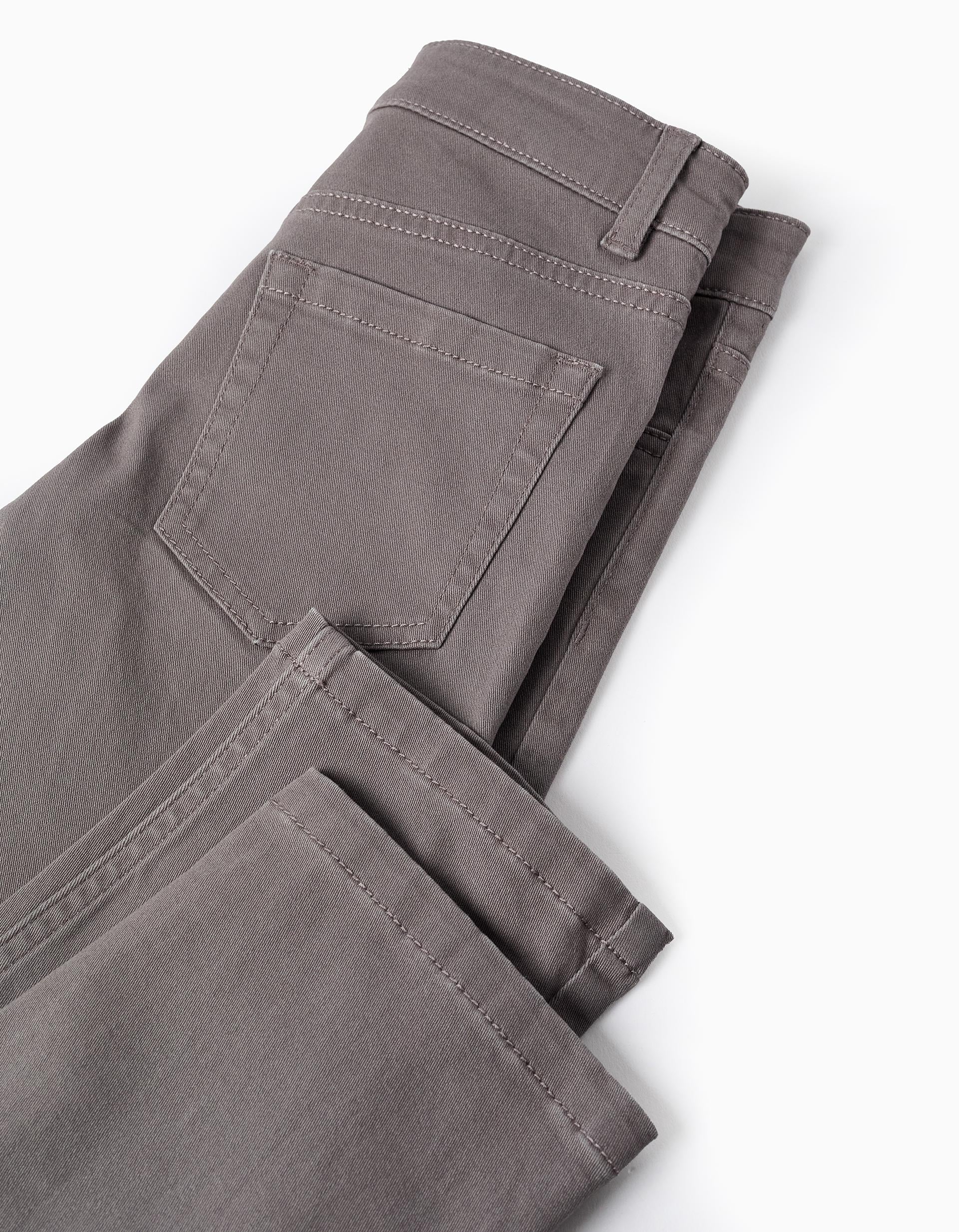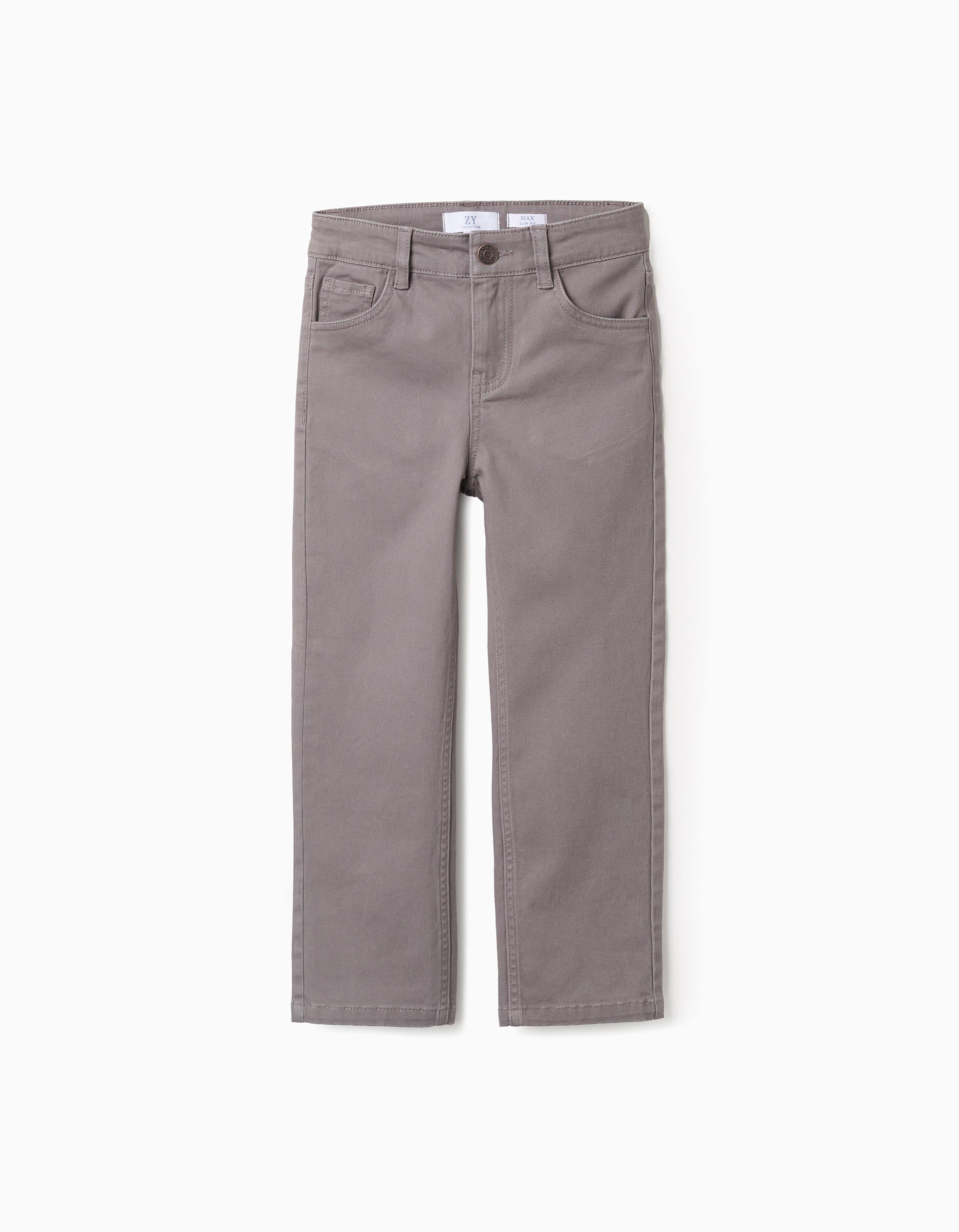 Grey trousers for boys, in cotton twill with a touch of stretch for greater comfort and freedom of movement. Adjustable waist on the inside with elastics and buttons. Four pockets. Slim fit. A versatile pair of trousers, perfect to wear with polos, shirts or t-shirts. Big Me: fastens with a snap button under a decorative button up to size 8/9, to facilitate dressing and promote the child's autonomy.
