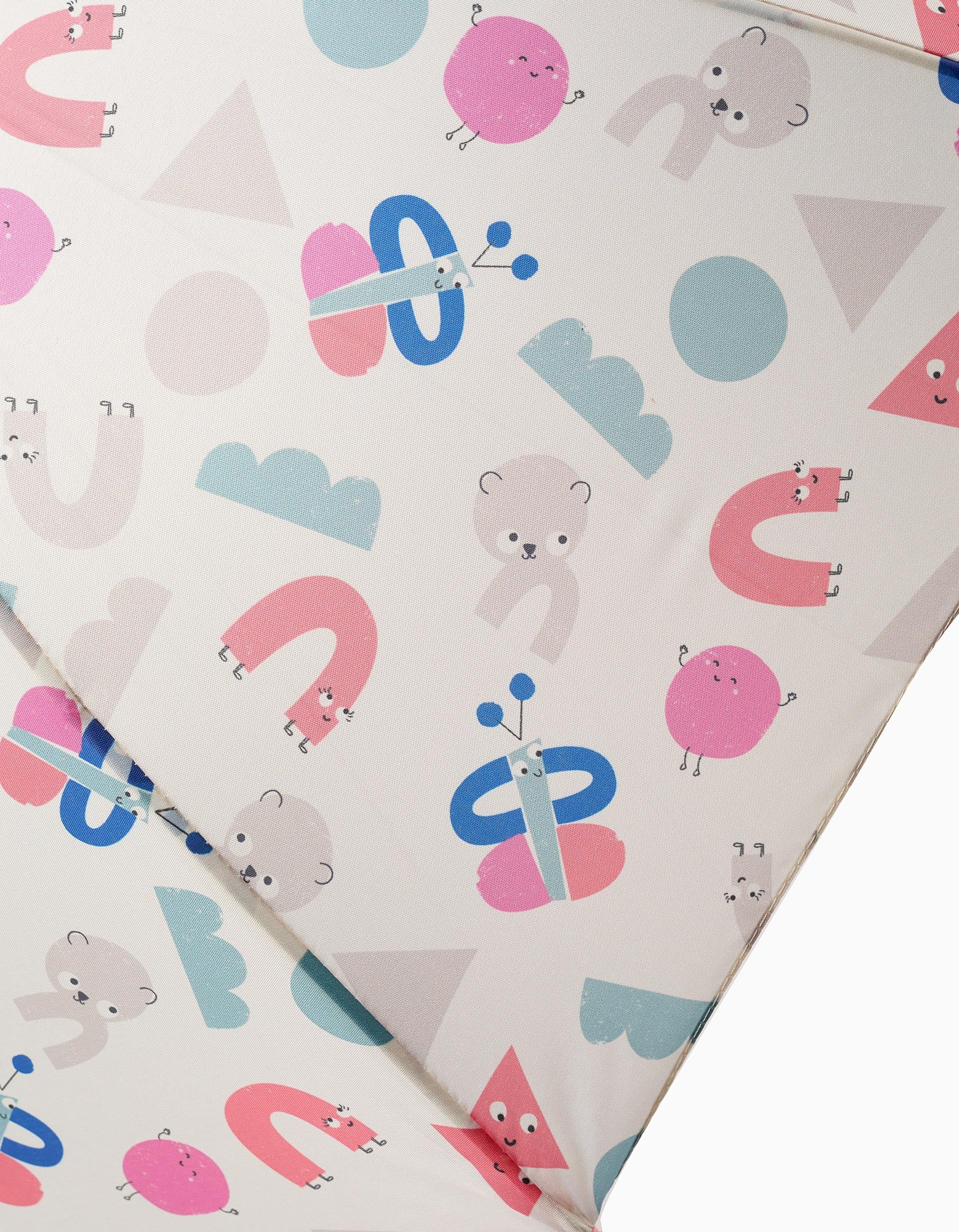 Beige umbrella for baby and girls, with a varied pattern of shapes and colours. Fastens with touch fastener strap. Automatic opening with protection system and plastic handle. Tip and base of the ribs with pink plastic balls for added safety. A practical and fun accessory for rainy days.
