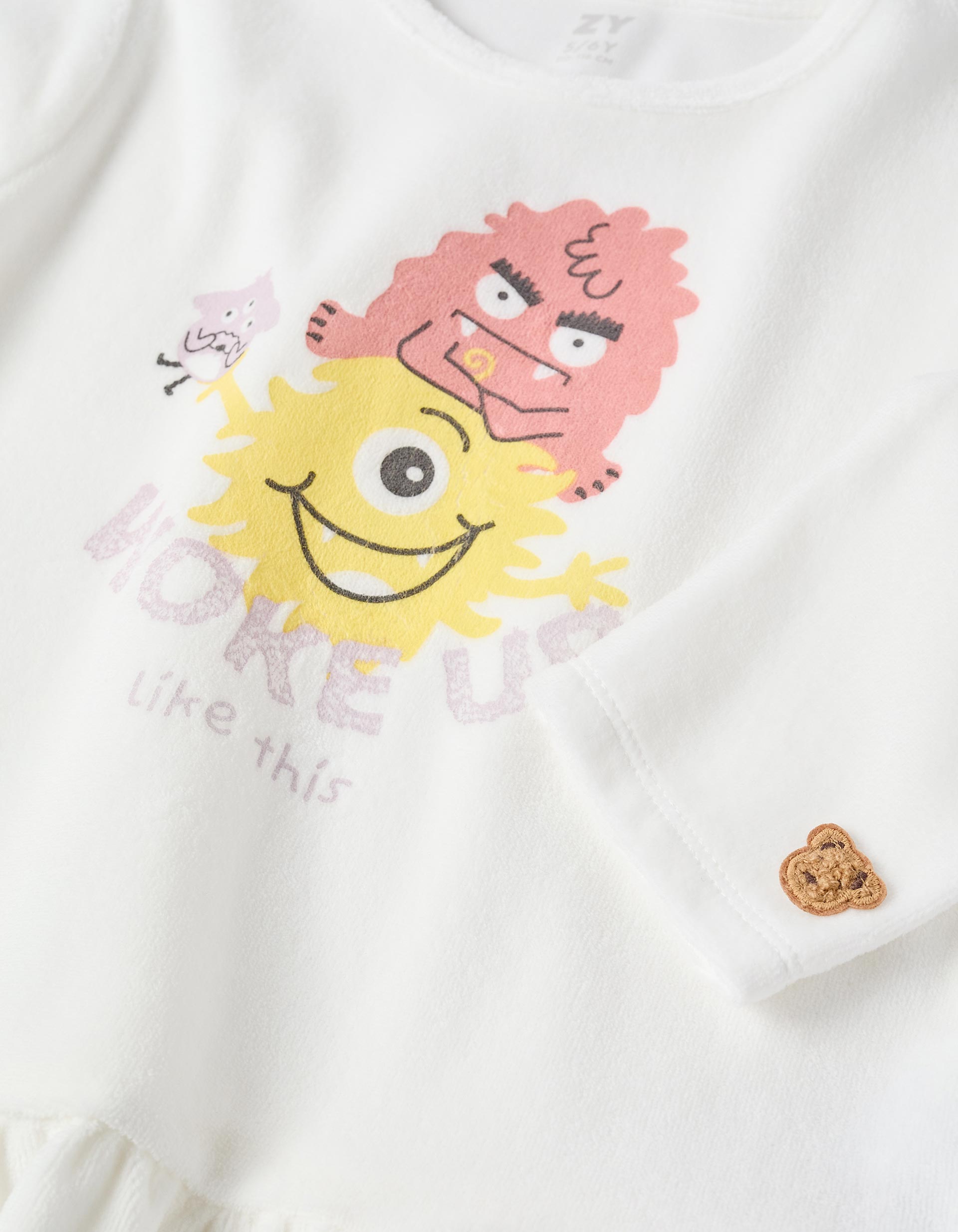 White and lilac Velour pyjama for girls, to ensure greater thermal comfort. Top with a print of the monsters of joy, anger, and fear. Base with frills. Plain lilac trousers. Printed inner labels to avoid irritating the skin. A cosy and fun pyjama, a way to encourage children to talk about their emotions from an early age! With a raised puppy on the cuff, Ziggy, so that children never feel alone at night, fostering their autonomy and emotional self-regulation.