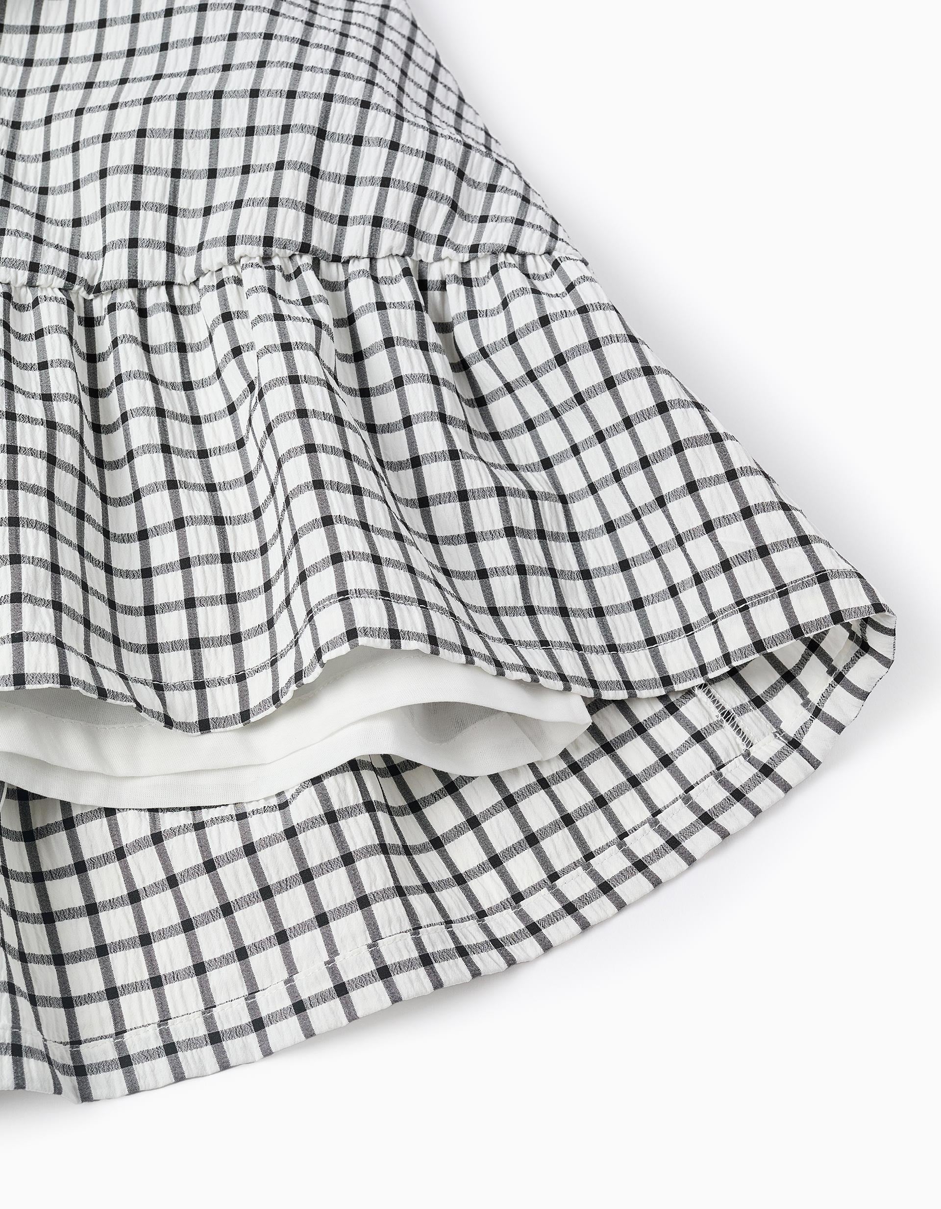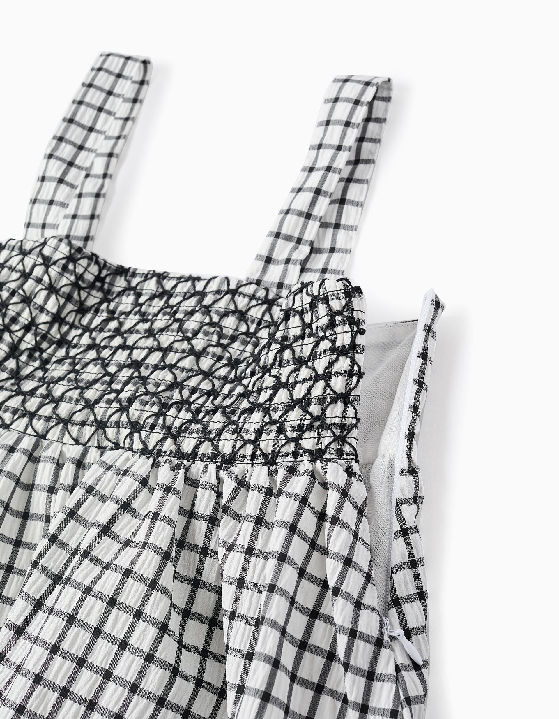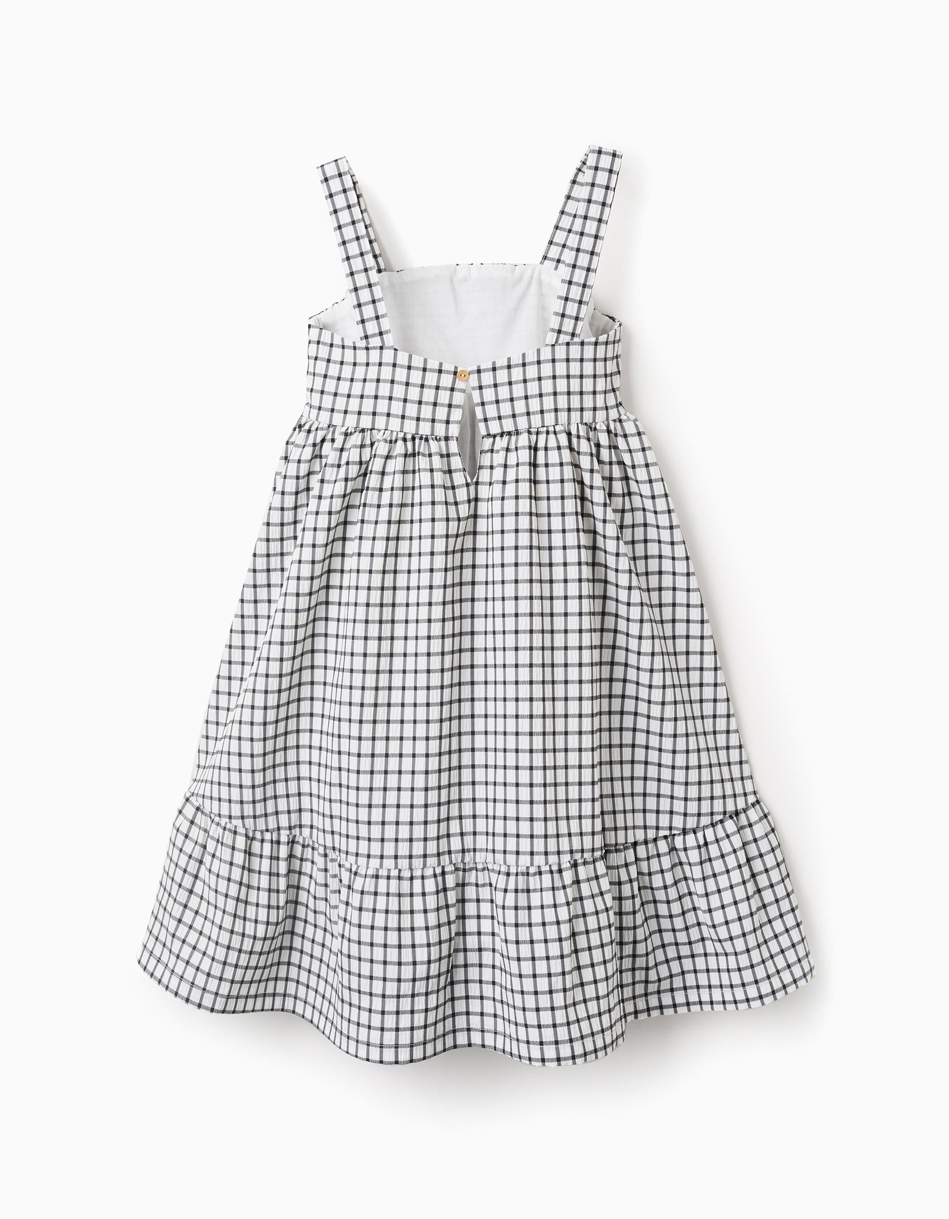 White strappy dress with dark grey Vichy pattern for girls. Elasticated chest with contrast details. Evasé cut with ruffles at the bottom. Invisible zip at the side and button at the back. With 100% cotton lining. Original and elegant, suitable for any occasion!