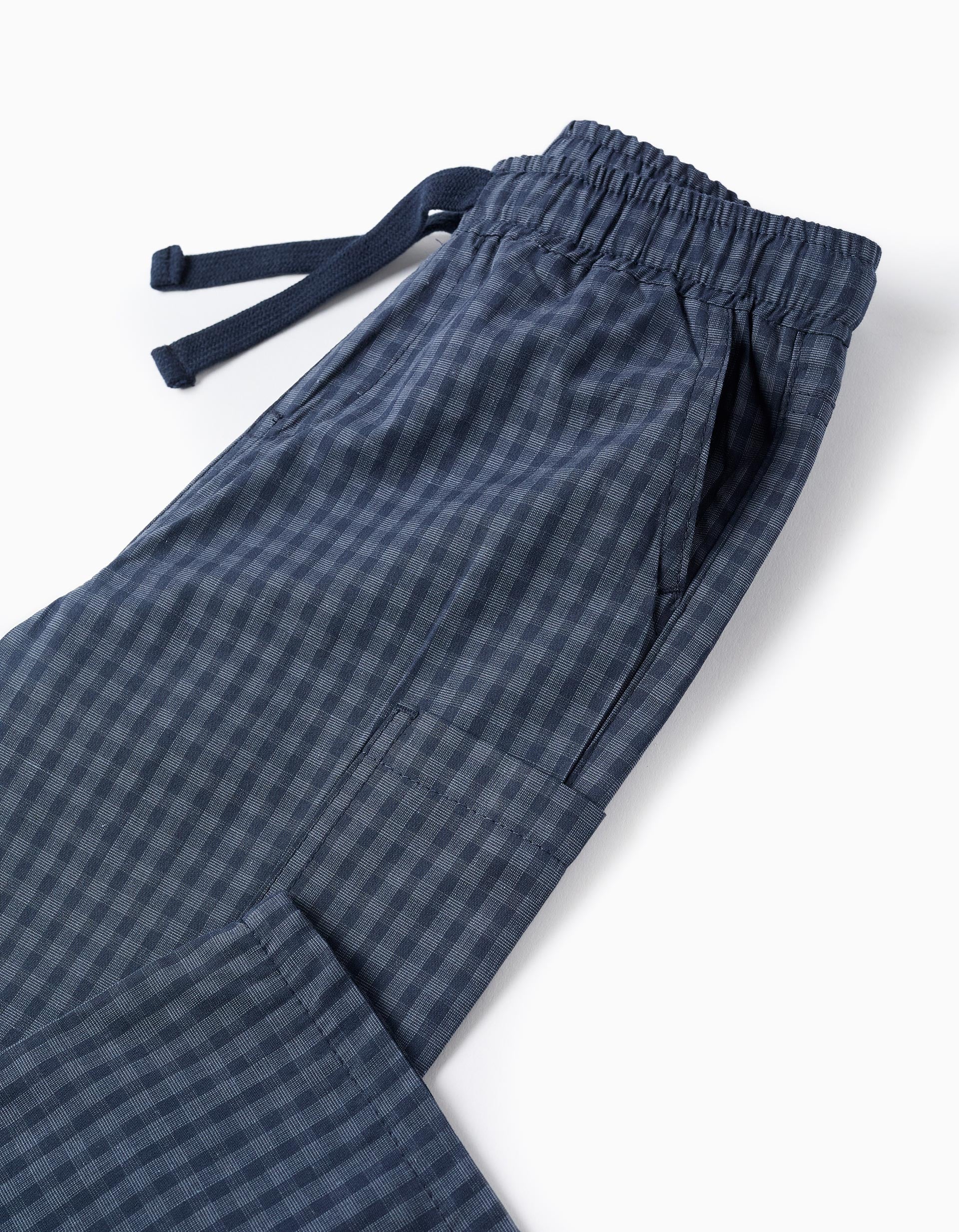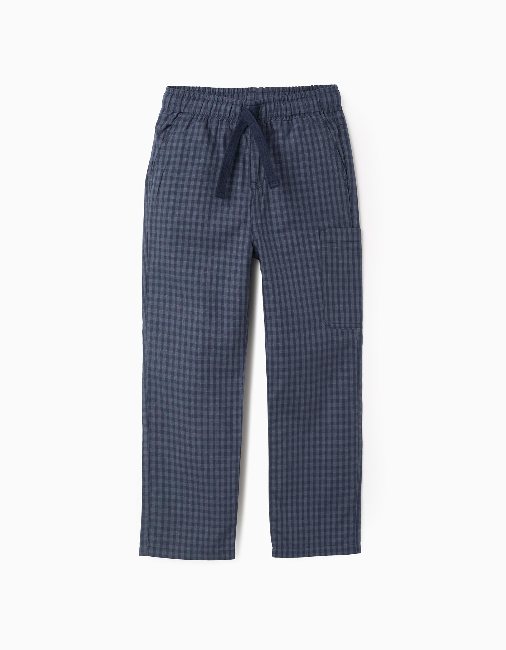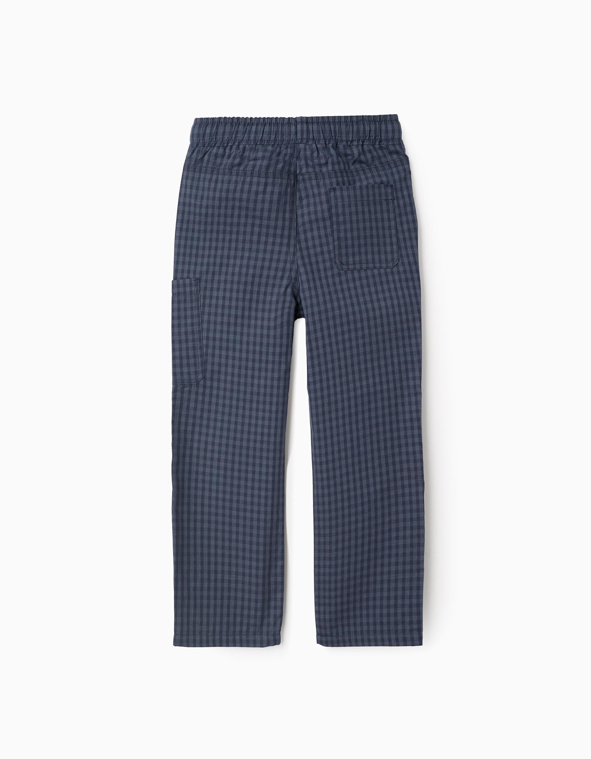 Dark blue Vichy check trousers for boys, in a cotton blend. Straight fit. Side pockets, back pocket and cargo pocket. Elasticated waistband with drawstring. A lightweight fabric with a unique pattern for one-of-a-kind looks!