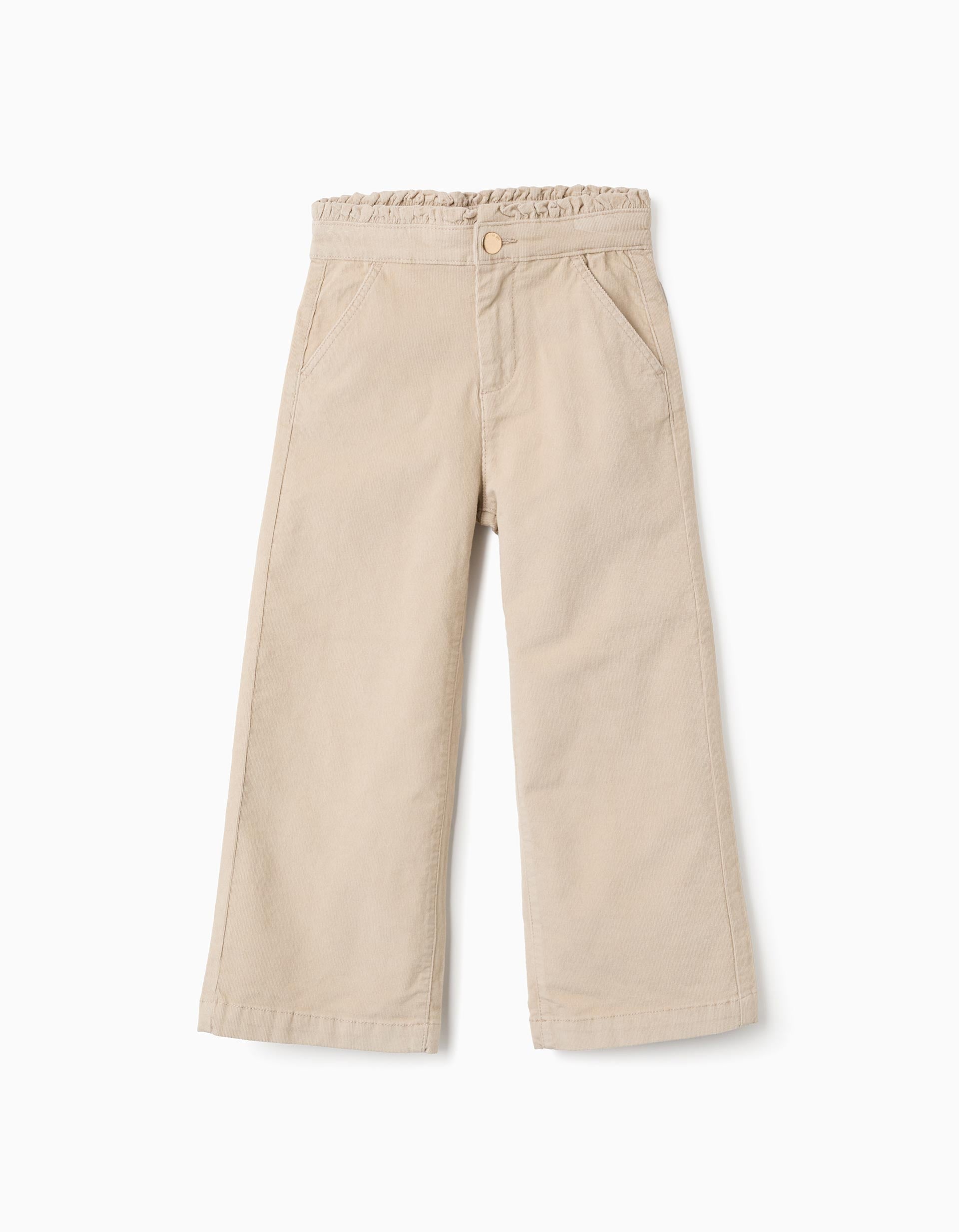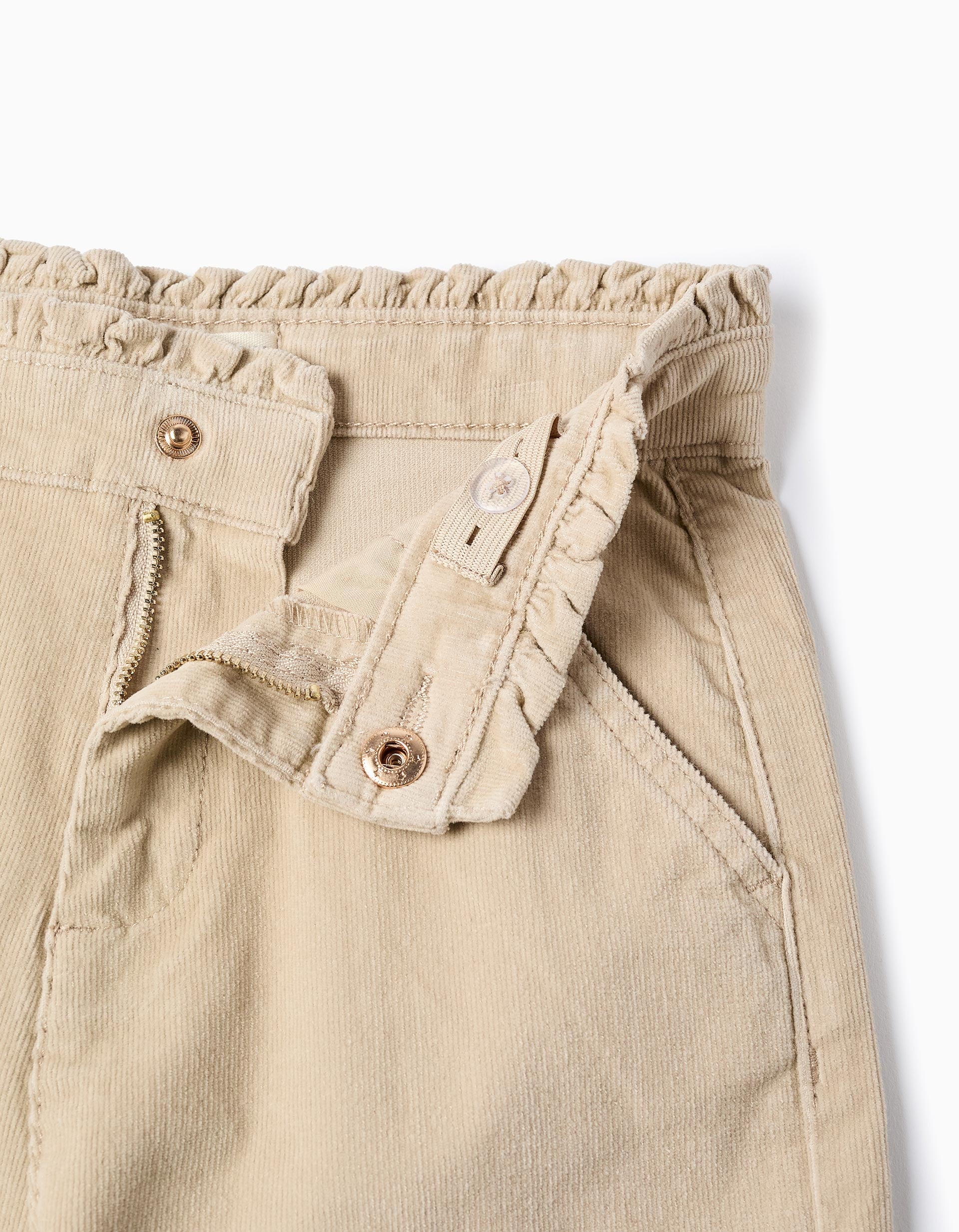Beige trousers for girls, in cotton corduroy with a touch of stretch for greater comfort and freedom of movement. Wide leg model. Four pockets. Waistband with ruffles, adjustable on the inside with elastic bands and buttons. For colourful, fashionable autumn-winter looks! Big Me: fastens with a press stud under a decorative button up to size 8/9, to make dressing easier and promote your child's autonomy.
