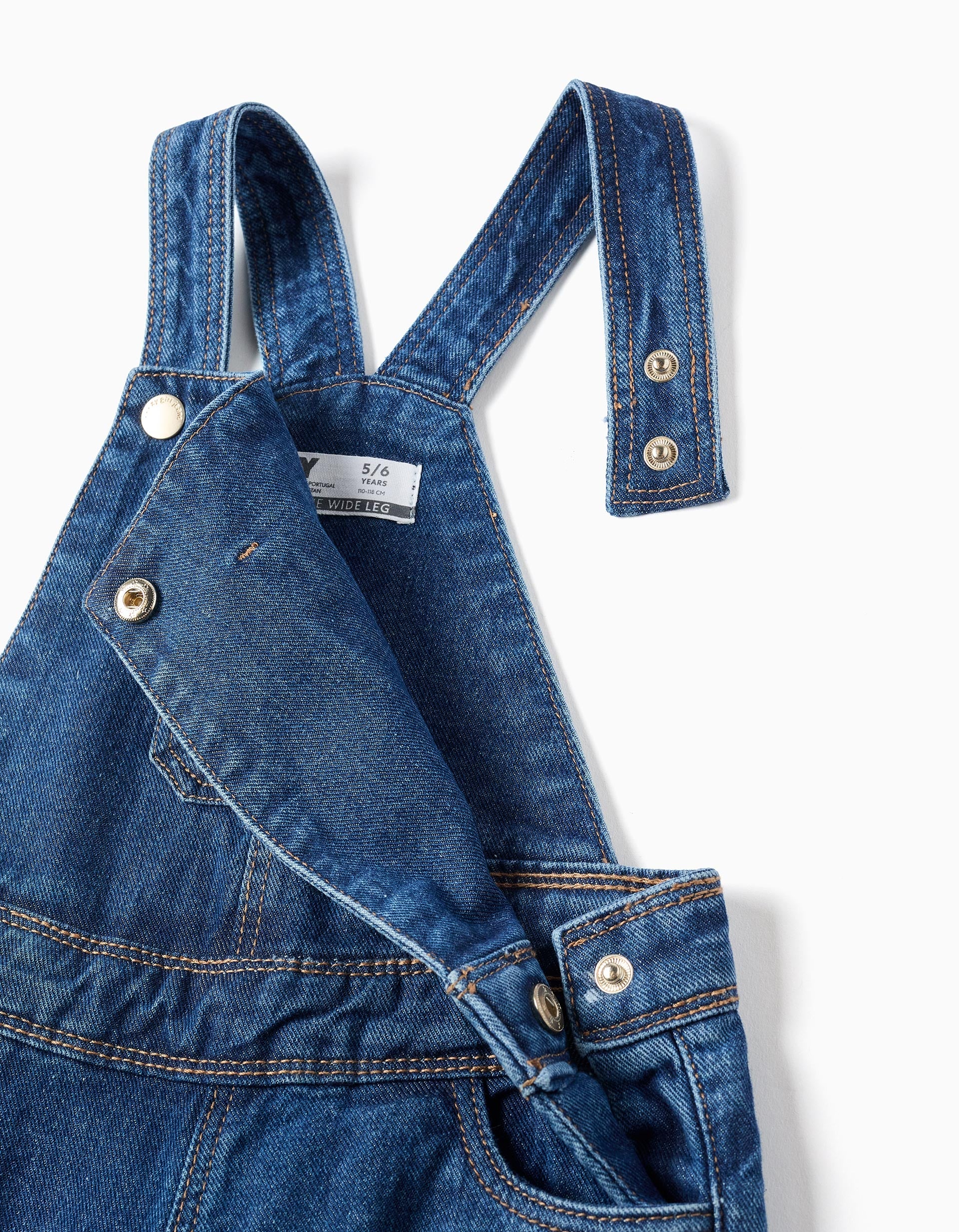 Blue denim dungarees for girls, 100% cotton. Wide leg model. Two pockets on the sides, two on the back and one on the chest. Adjustable straps with snap buttons. Side snap buttons for a perfect fit. A classic of the wardrobe, perfect for everyday activities!
